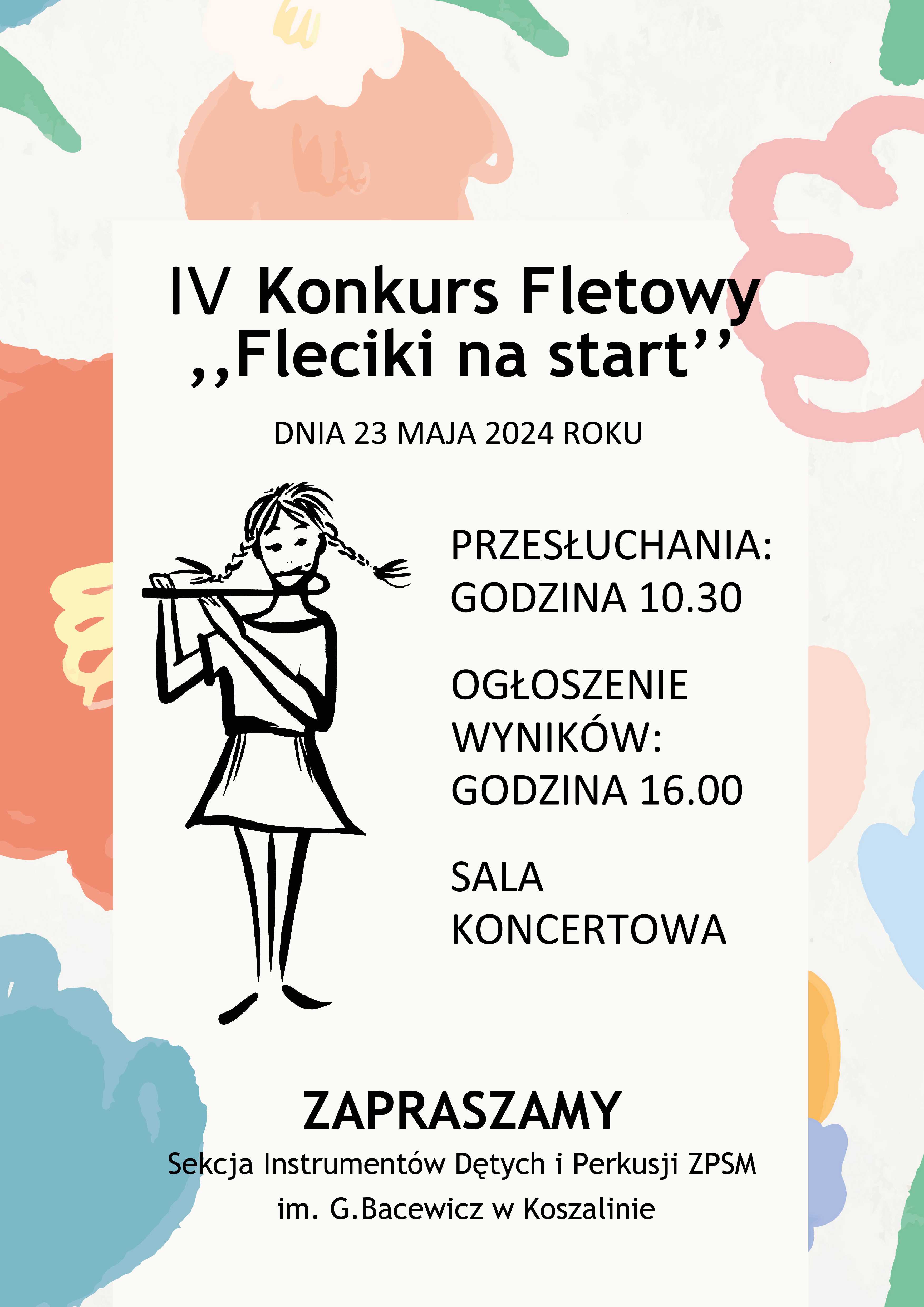 Serdecznie zapraszamy do udziału w IV Konkursie Fletowym "Fleciki na start", który odbędzie się dnia 23 maja 2024 r. w Zespole Państwowych Szkół Muzycznych im. Grażyny Bacewicz w Koszalinie. Konkurs skierowany jest do uczniów klas I - III cyklu 6-letniego Szkół Muzycznych I stopnia.