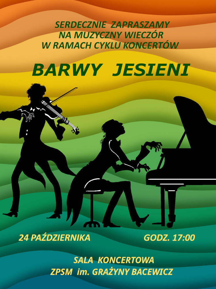Serdecznie zapraszamy, jak co roku o tej porze, na muzyczne wydarzenie z cyklu BARWY JESIENI. Koncert odbędzie się 24 października 2024 r., o godz. 17.00 na sali koncertowej naszej szkoły.