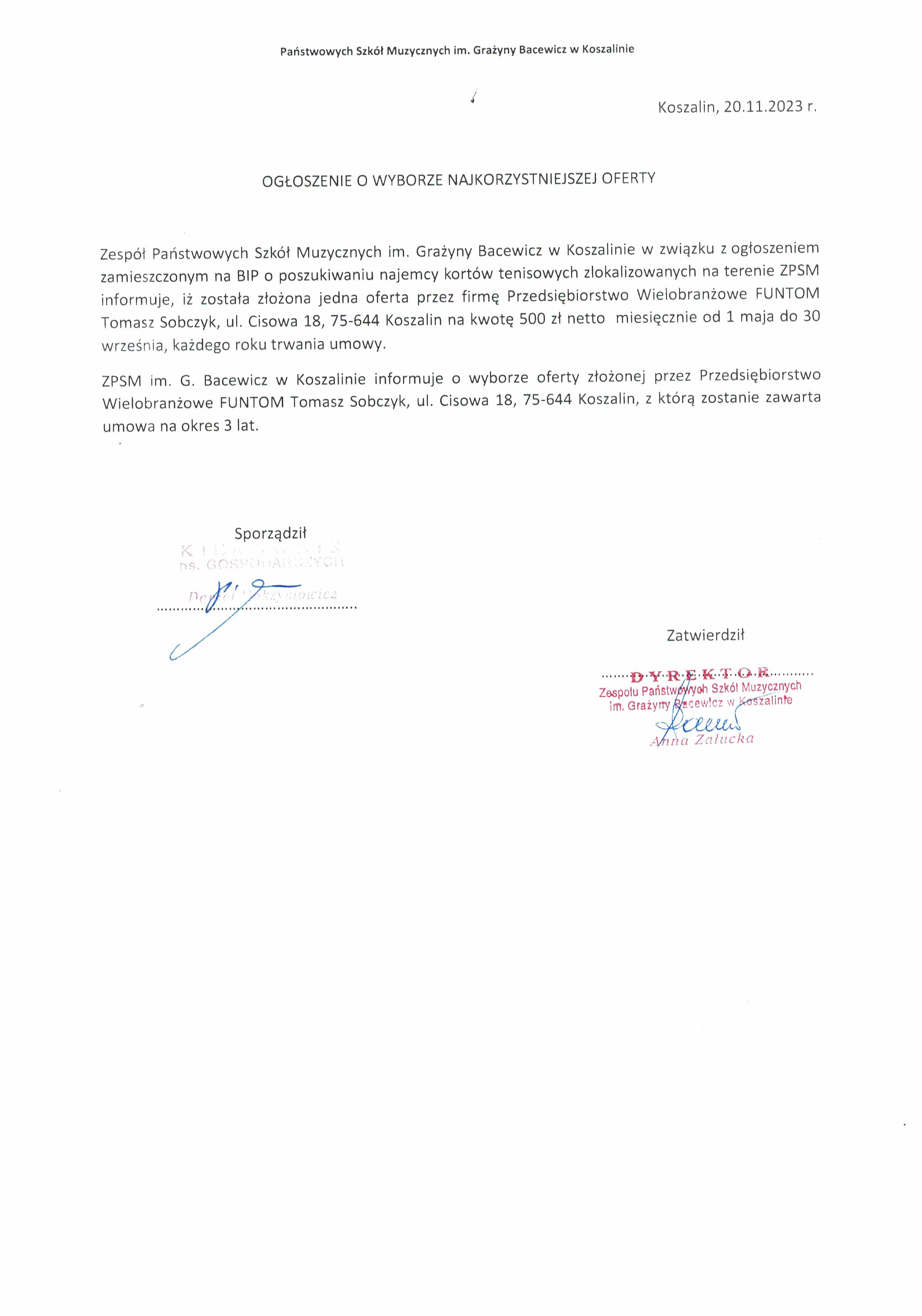 | Ogłoszenie o poszukiwaniu najemcy kortów tenisowych | 2.0 | 20.11.2023 11:28 Krzysztof Czarnecki |