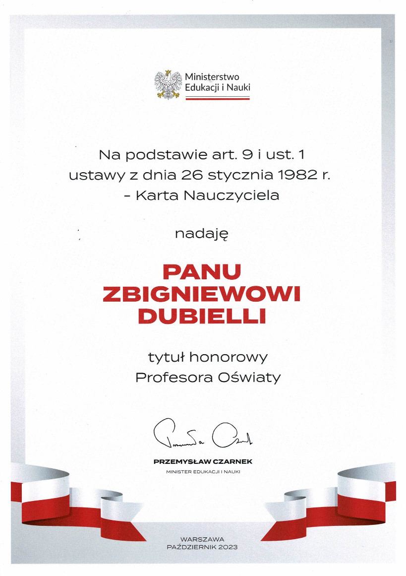 Zbigniew Dubiella uzyskał tytuł honorowego Profesora Oświaty. Bardzo się cieszymy i gratulujemy.