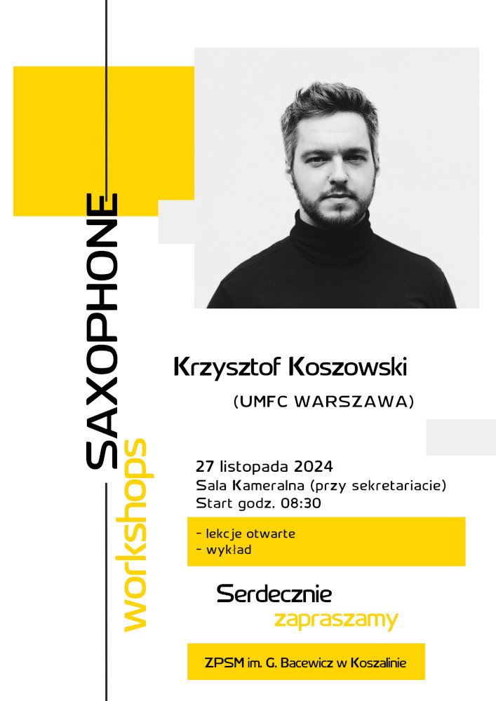 Zapraszamy na warsztaty saksofonowe, które odbędą się 27 listopada 2024 r. w naszej szkole. Zajęcia poprowadzi wykładowca Uniwersytetu Muzycznego Fryderyka Chopina w Warszawie Pan Krzysztof Koszowski.