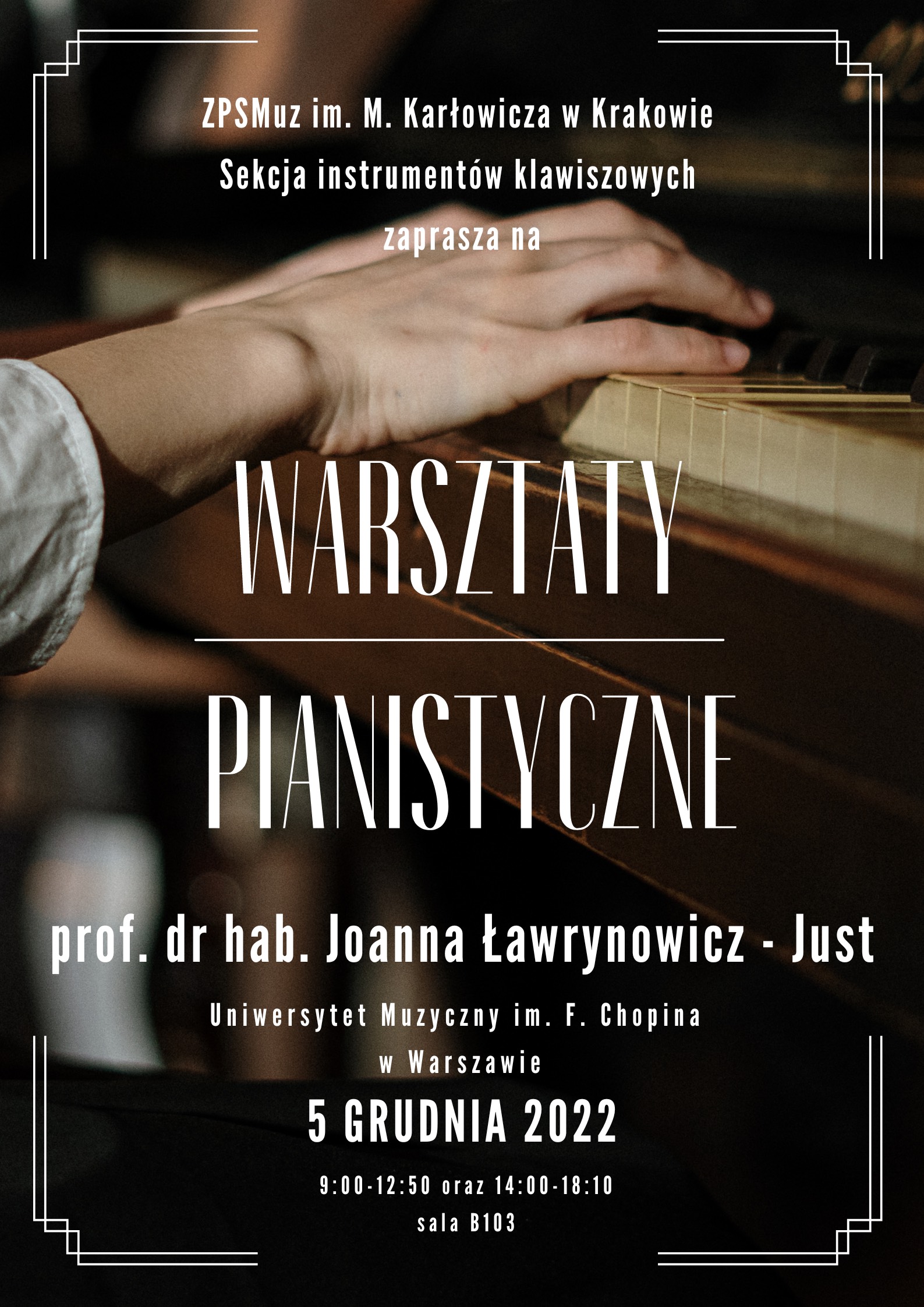 Zespół Państwowych Szkół Muzycznych imienia Mieczysława Karłowicza w Krakowie zaprasza na Warsztaty Pianistyczne, prowadzone przez prof. dr hab. Joannę Ławrynowicz-Just z Uniwersytetu Muzycznego imienia Fryderyka Chopina w Warszawie, które odbędą się 5 grudnia 2022 w godzinach 9:00-12.50 oraz 14.00-18.10 w sali B 103. Serdecznie zaprasza Sekcja Instrumentów Klawiszowych