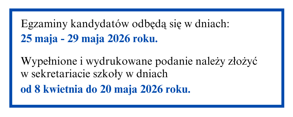 Lista kandydatów zakwalifikowanych i kandydatów niezakwalifikowanych do danej szkoły zostanie ogłoszona w terminie do 7 dni od zakończenia egzaminów wstępnych. Informację będzie można również uzyskać telefonicznie poprzez sekretariat.