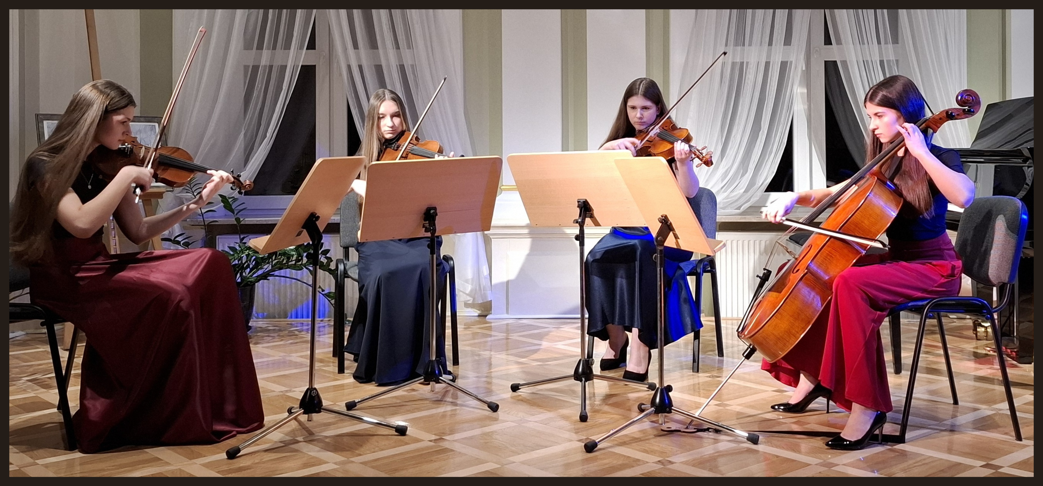 W drugiej części koncertu usłyszeliśmy Divertimento F-dur W. A. Mozarta w wykonaniu kwartetu smyczkowego w składzie: Gabriela Majchrowicz, Apolonia Ścibor, Maja Zuzmak i Martyna Polnik. Zespół pracuje pod kierunkiem pani Magdaleny Betlei.