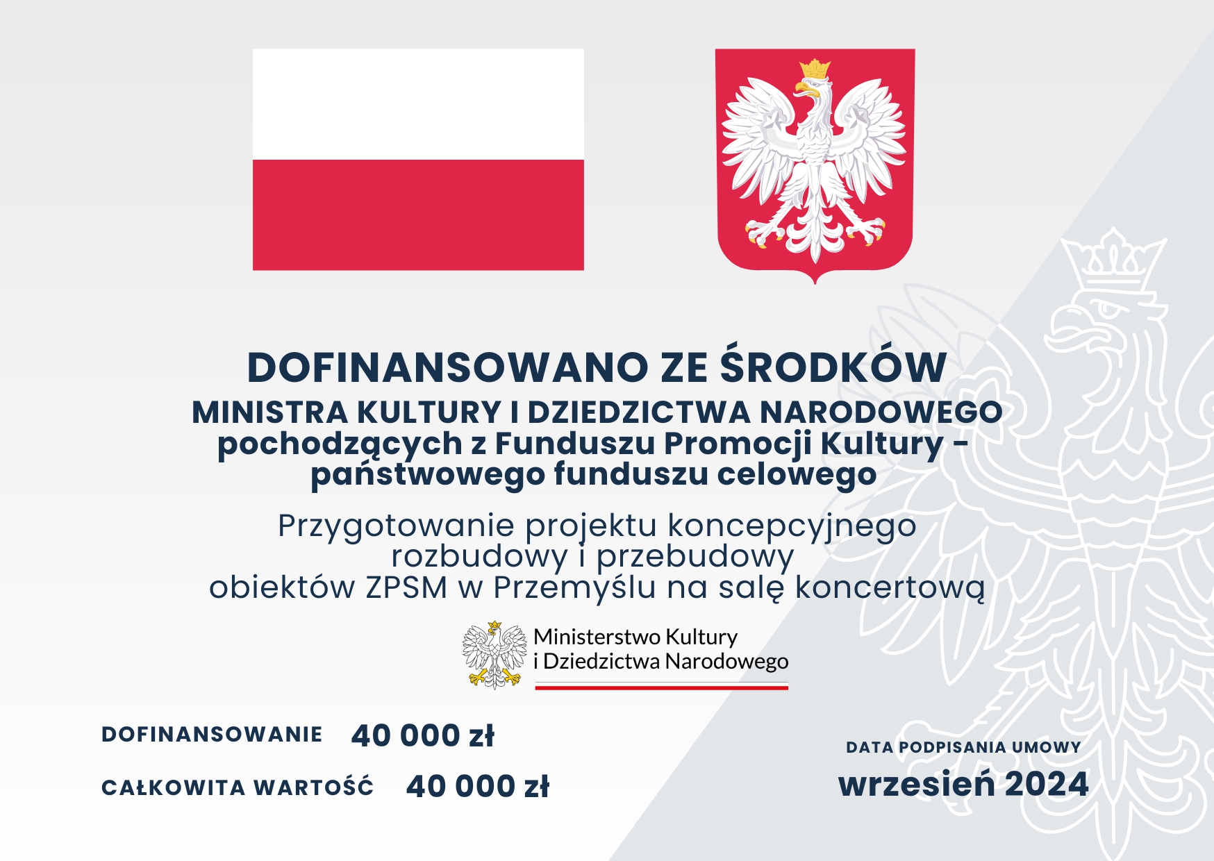 Dofinansowanie do zadania - „Przygotowanie projektu koncepcyjnego rozbudowy i przebudowy obiektów ZPSM w Przemyślu na salę koncertową”.
