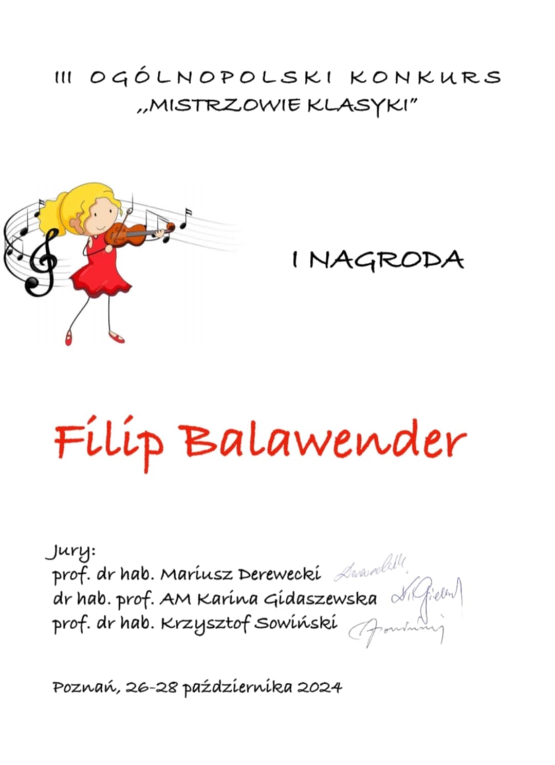 Filip Balawender laureatem I miejsca w III Ogólnopolskim Konkursie "Mistrzowie Klasyki" w Poznaniu!
