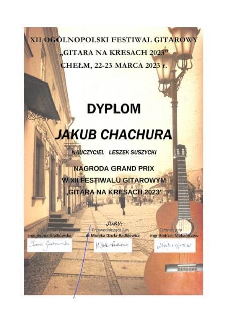 Jakub Chachura otrzymał nagrodę Grand Prix podczas XII Ogólnopolskiego Festiwalu Gitarowego „Gitara na kresach 2023", który odbył się online w dniach 22-23 marca 2023 roku w Chełmie.
