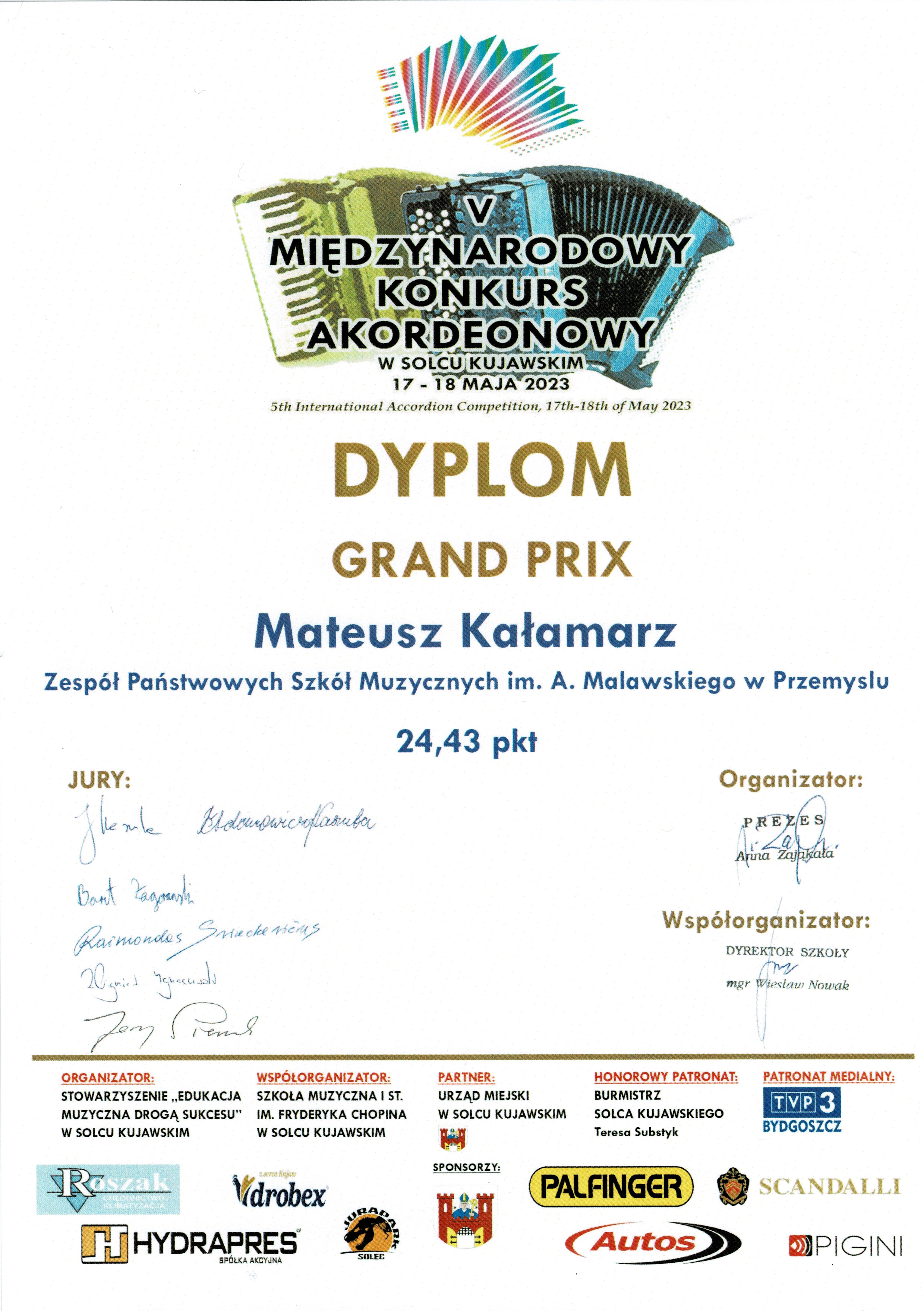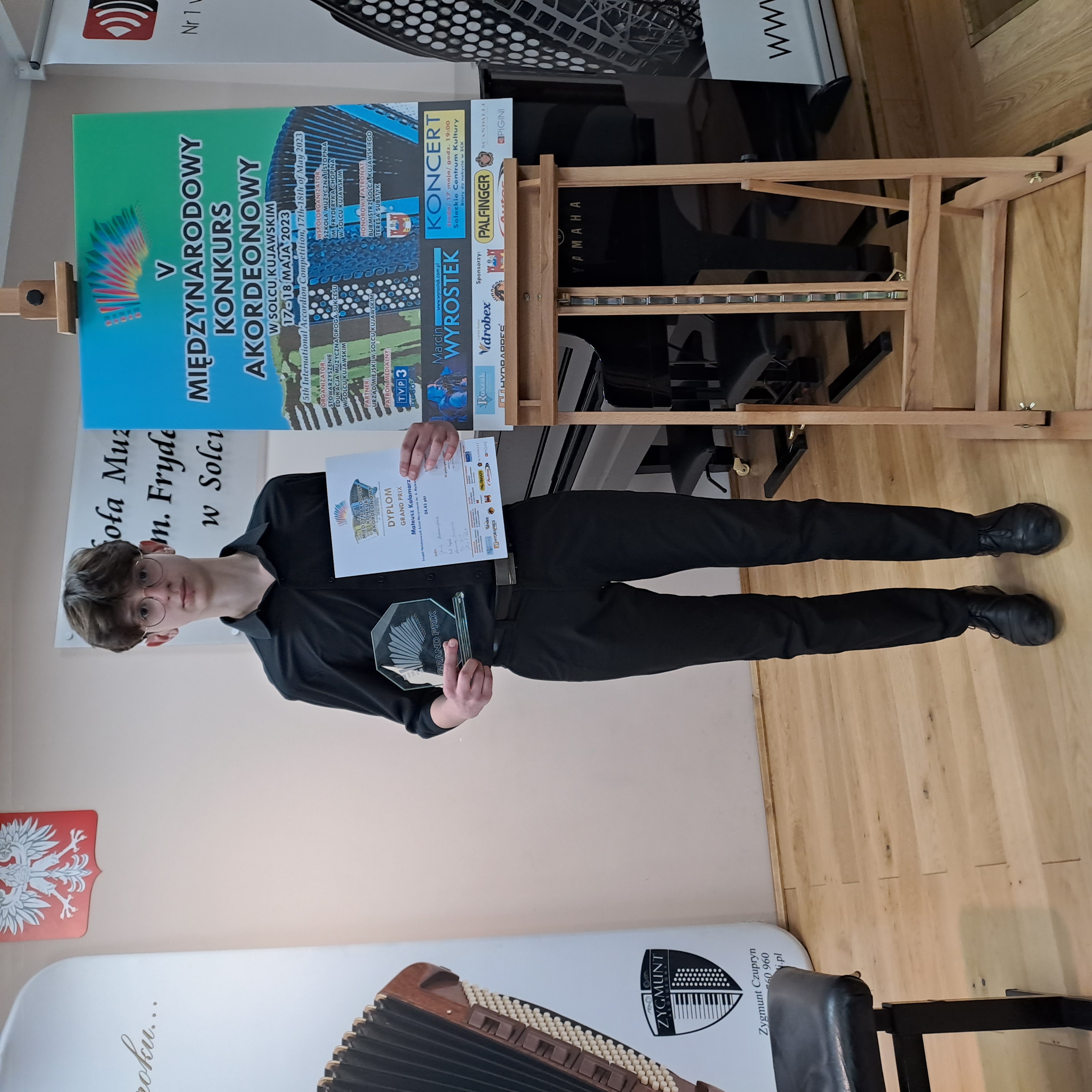 Jury konkursowe, pracujące pod kierunkiem prof. Jerzego Kaszuby przyznało w tej sytuacji Mateuszowi Grand Prix V Międzynarodowego Konkursu Akordeonowego w Solcu Kujawskim.