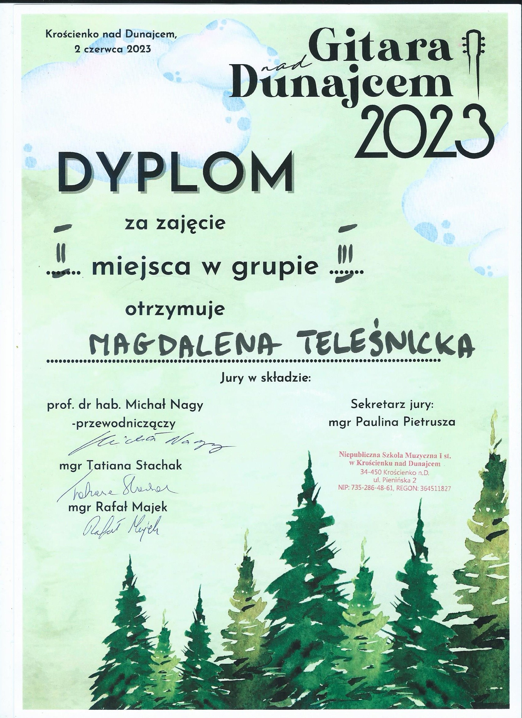 Bardzo wysoko w tym konkursie została oceniona uczennica klasy gitary OSM I stopnia Magdalena Teleśnicka, która została Laureatką II miejsca w kat.III.