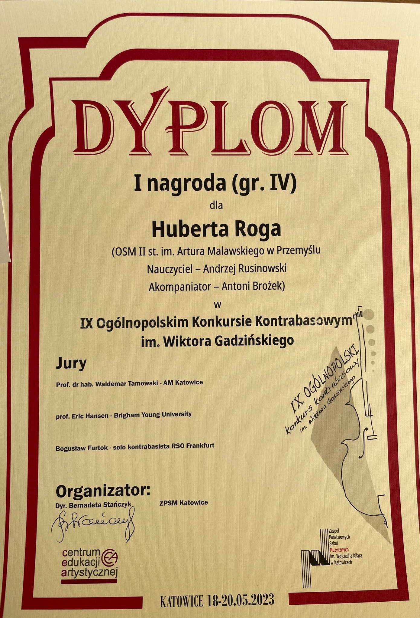 HUBERT RÓG otrzymał I miejsce w najstarszej IV grupie wiekowej w IX Ogólnopolskim Konkursie Kontrabasowym im. W. Gadzińskiego, który odbył się w dniach 18-20 maja 2023 roku w Katowicach .