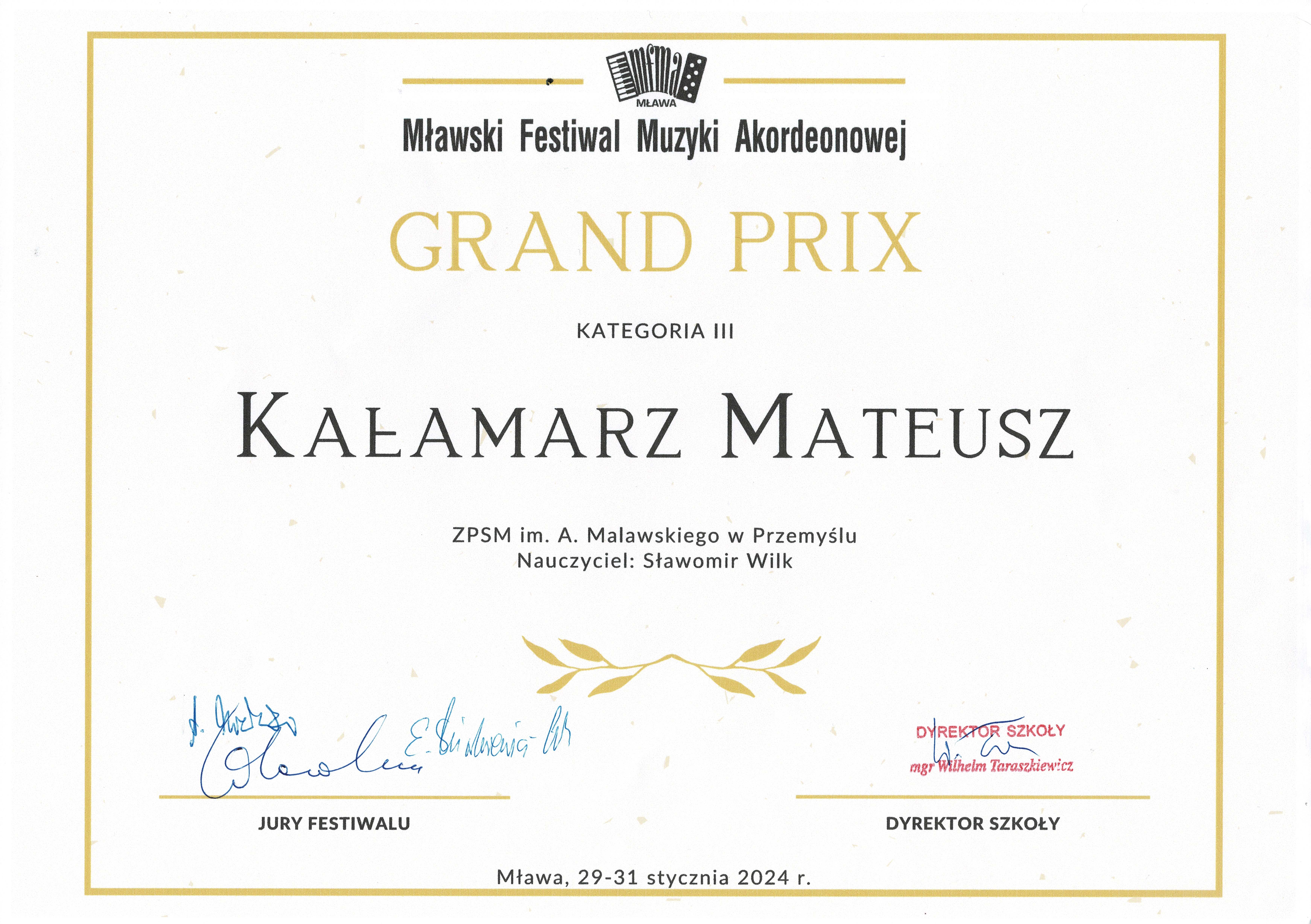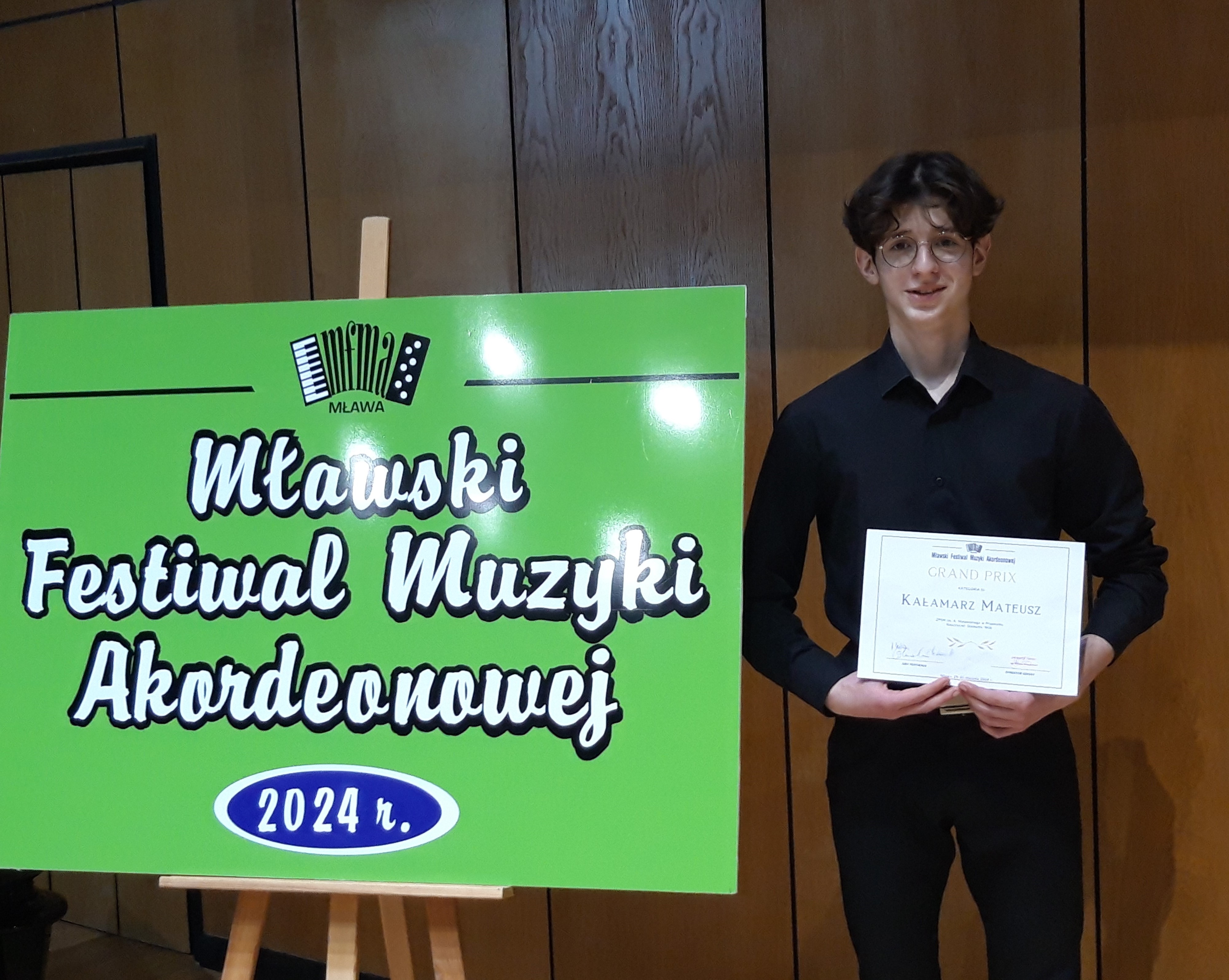 Znakomitym sukcesem Mateusza Kałamarza, młodego akordeonisty z naszej Szkoły zakończył się Mławski Festiwal Muzyki Akordeonowej, który odbył się w dniach 29-31 stycznia br. w Mławie.