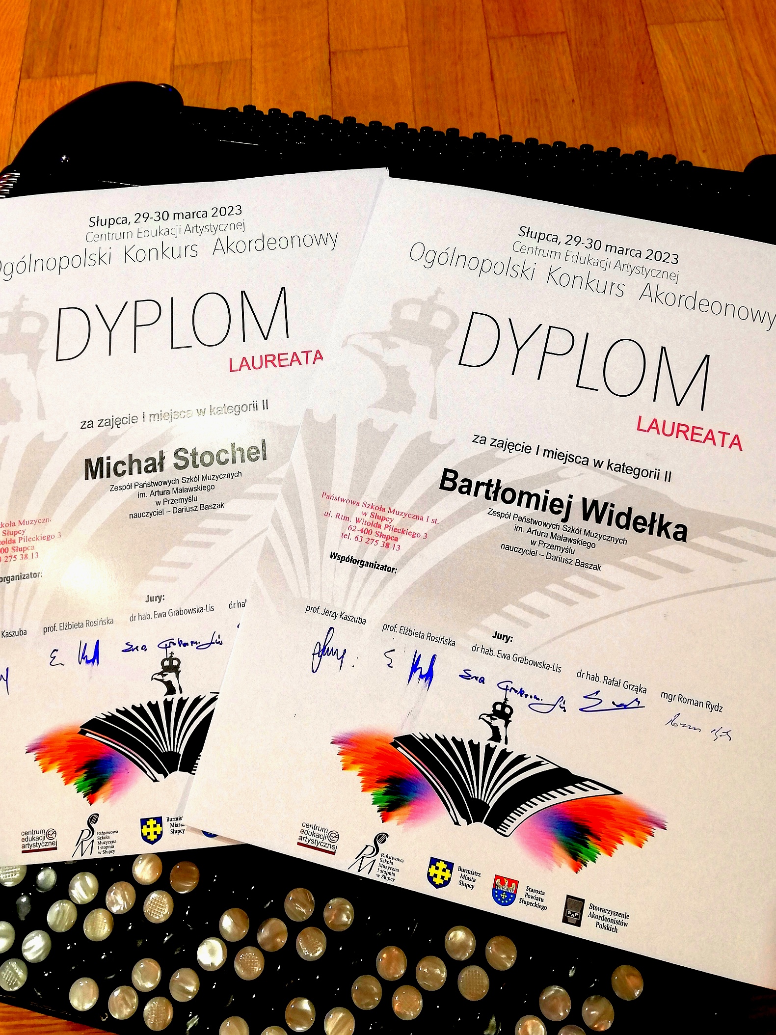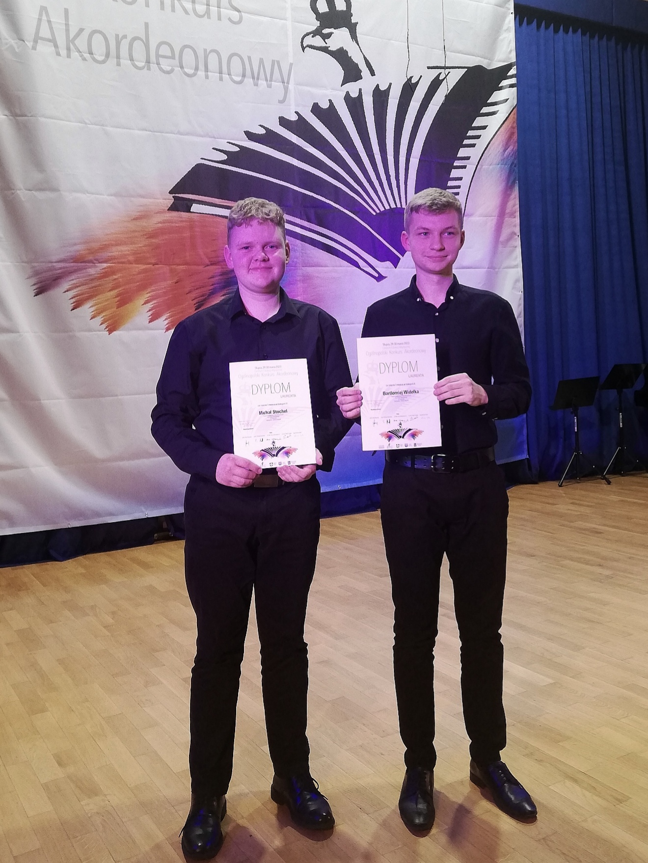Młodzi akordeoniści naszej Szkoły: Michał Stochel oraz Bartłomiej Widełka, uczący się na co dzień pod kierunkiem pana dyrektora Dariusza Baszaka zostali zwycięzcami kategorii II, zajmując w konkursie ex aequo I miejsce.