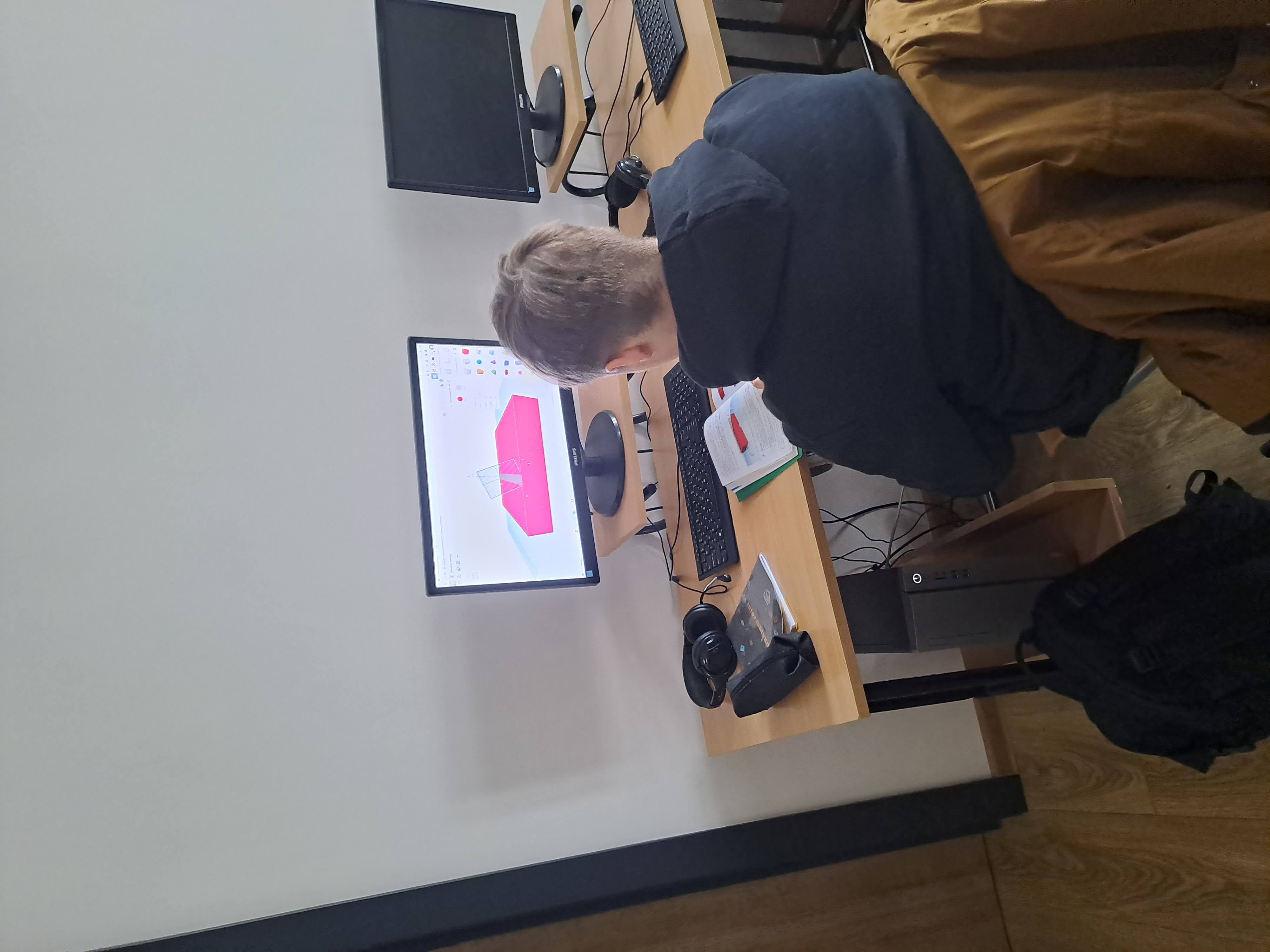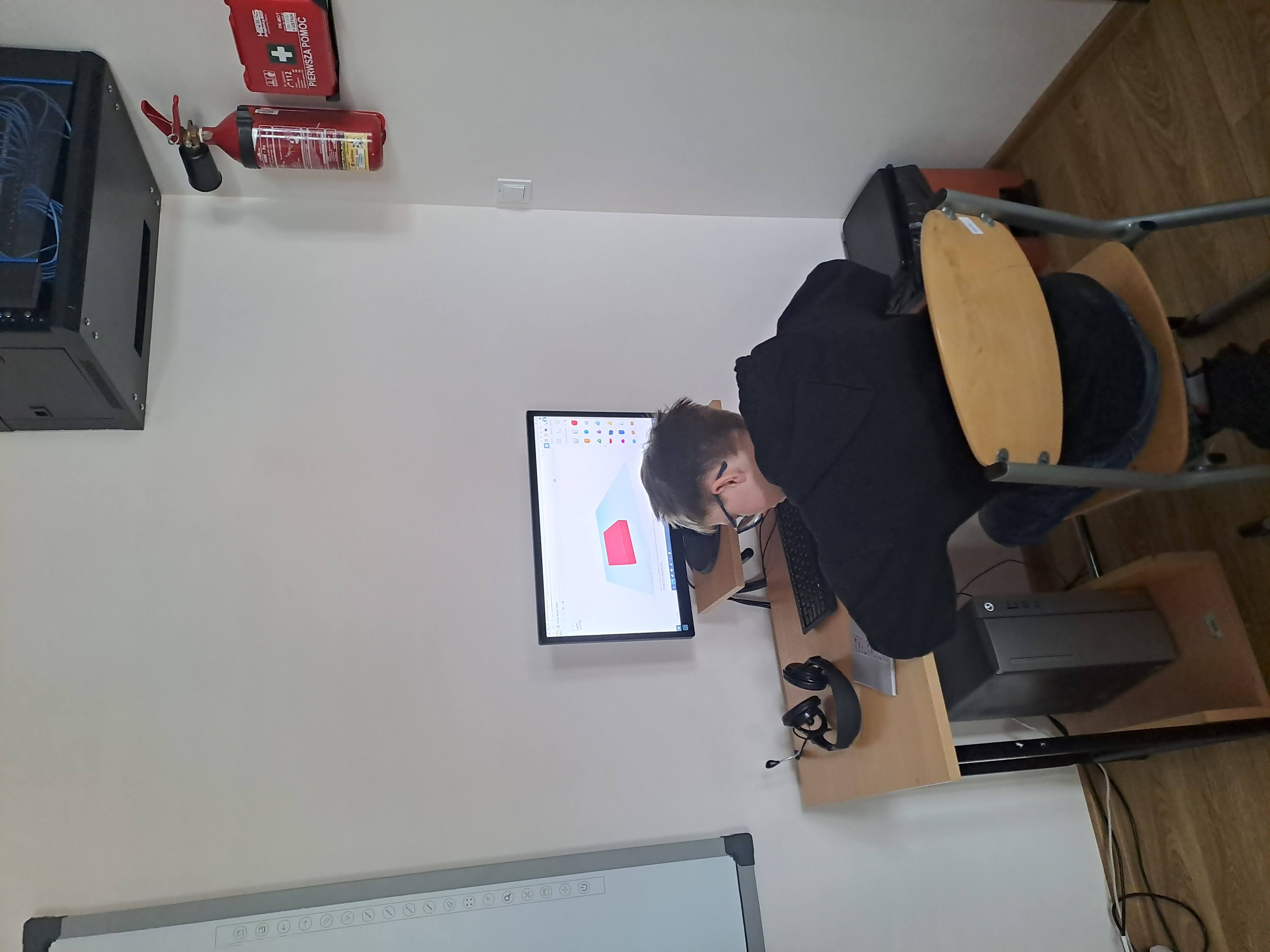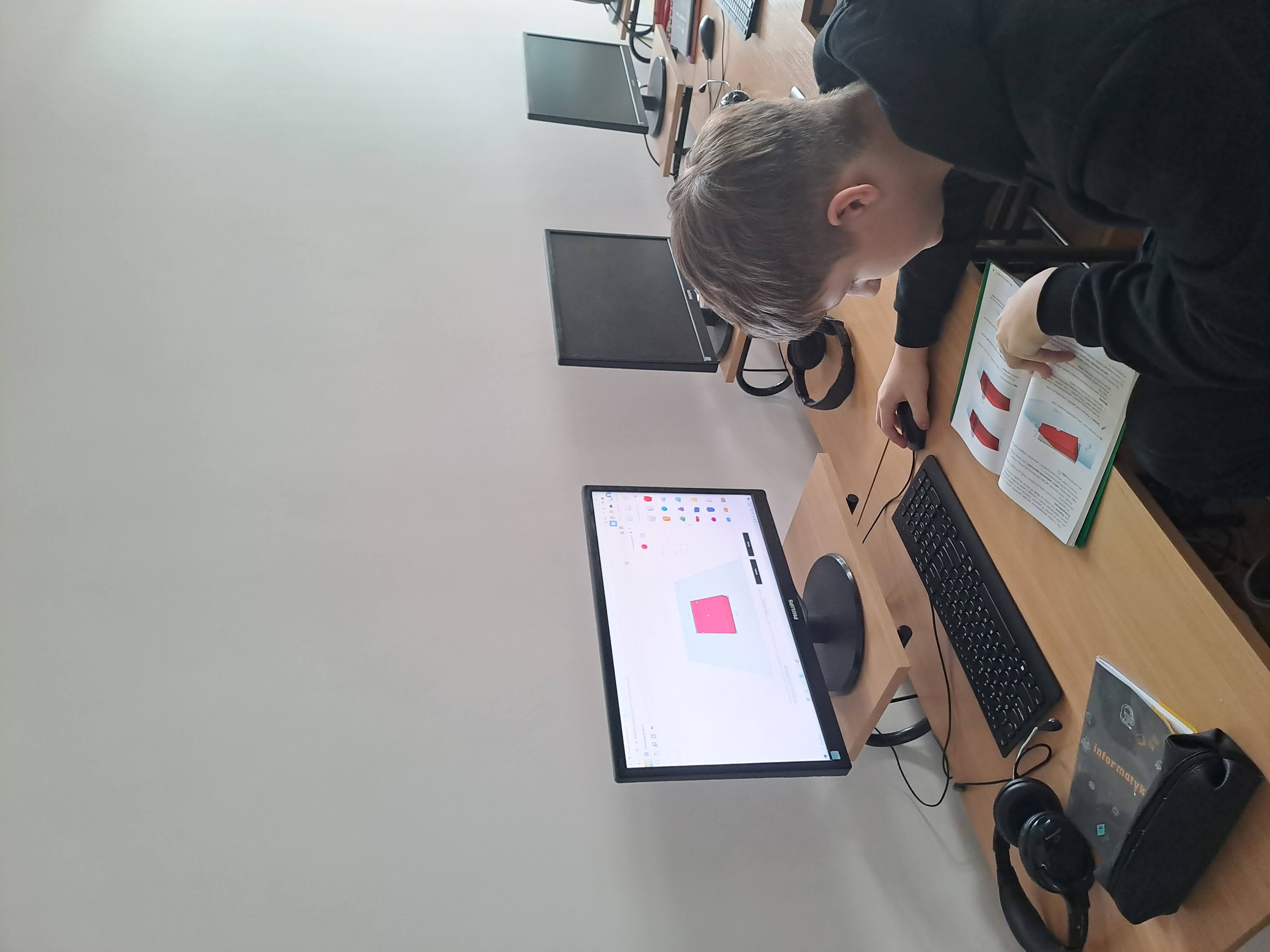 Rozpoczęliśmy również przygotowania do druku 3D. Uczniowie klasy 7 tworzyli modele 3D w programie Tinkercad. Zaprojektowaliśmy model podstawki pod smartfon lub tablet. Do tworzenia naszego modelu wykorzystaliśmy darmowy program graficzny, wspomniany już Tinkercad. Jest on dostępny online poprzez przeglądarkę internetową na stronie https://www.tinkercad.com, po założeniu bezpłatnego konta użytkownika. Program ten jest prostym środowiskiem do projektowania 3D z biblioteką gotowych przedmiotów, które można samodzielnie edytować, tworząc w ten sposób własne projekty. Przygotowaliśmy do druku zaprojektowany przez nas model, zapisując go z odpowiednim rozszerzeniem. Druk modelu zaplanowaliśmy w przyszłym miesiącu.