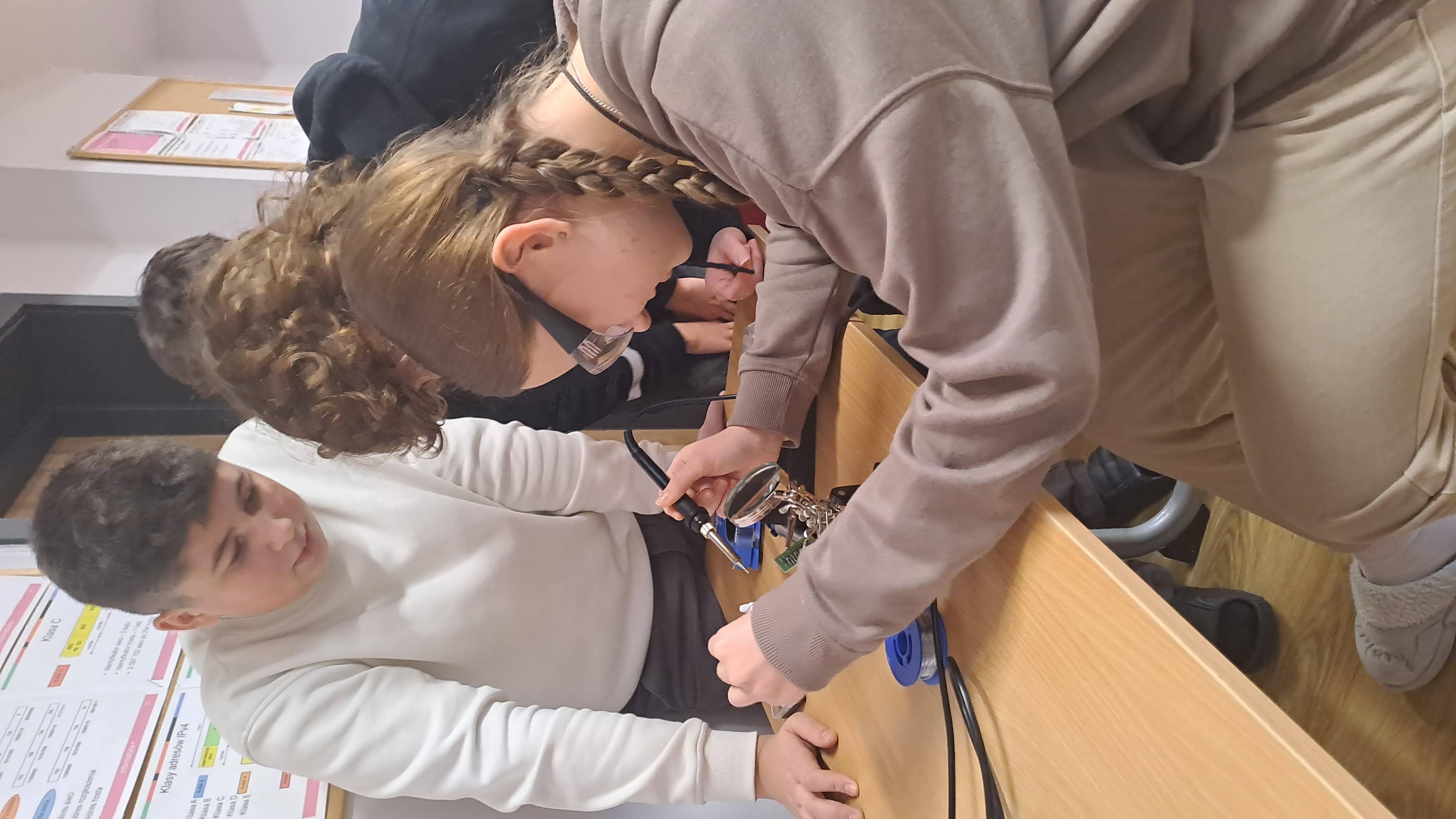 Jedną z najważniejszych umiejętności każdego majsterkowicza jest lutowanie. Jak się okazuje wielu początkujących nie radzi sobie poprawnie z operowaniem lutownicą. Aby nauczyć się tej umiejętności skorzystaliśmy z kursu lutowania dostępnego na stronie https://forbot.pl/blog/kurs-lutowania-wstep-spis-tresci-id12556. Zamówiliśmy niezbędnik warsztatowy, czyli komplet narzędzi, polecany na potrzeby tego kursu oraz zestaw elementów zawierający 5 płytek PCB oraz części elektroniczne do kursu lutowania m.in: diody, rezystory, goldpiny, przełączniki. Zarówno uczniowie starszych klas jak i młodsi bardzo dobrze radzili sobie z operowaniem lutownicą. Zajęcia dostarczyły wszystkim dużo frajdy.