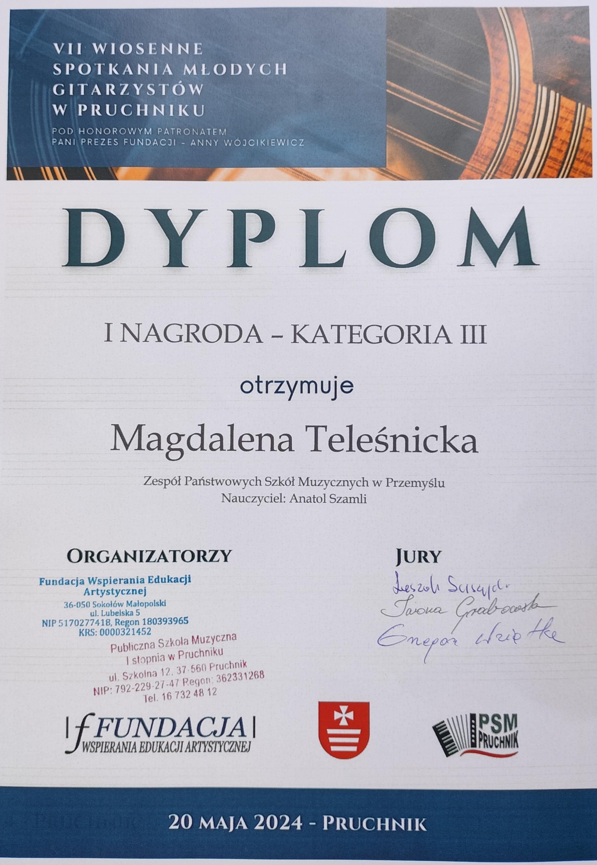 Sukces Magdaleny Teleśnickiej w VII Wiosennych Spotkaniach Młodych Gitarzystów w Pruchniku!