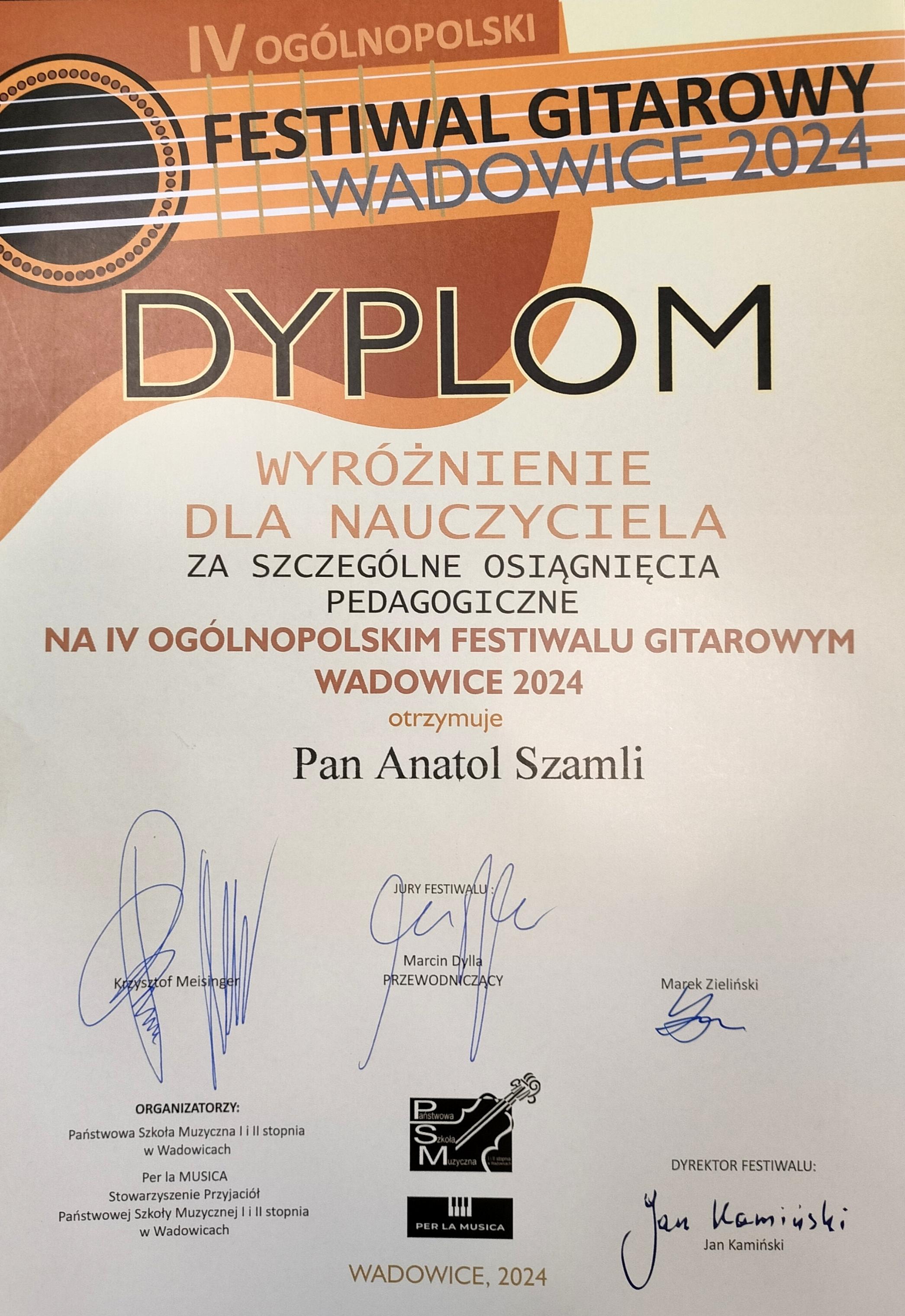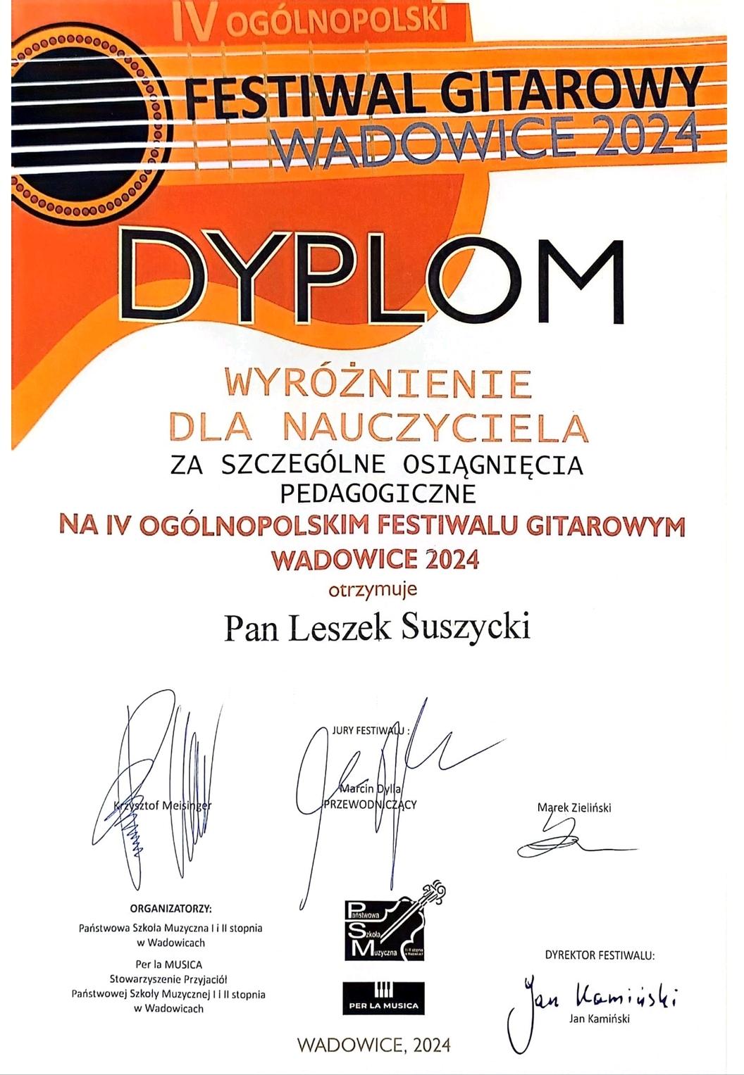 W dniach 12 i 13 kwietnia br. odbył się IV Ogólnopolski Konkurs Gitarowy - Wadowice 2024. Organizatorem konkursu jest Stowarzyszenie Przyjaciół Państwowej Szkoły Muzycznej I i II stopnia w Wadowicach „Per la Musica” oraz Państwowa Szkoła Muzyczna I i II stopnia w Wadowicach.