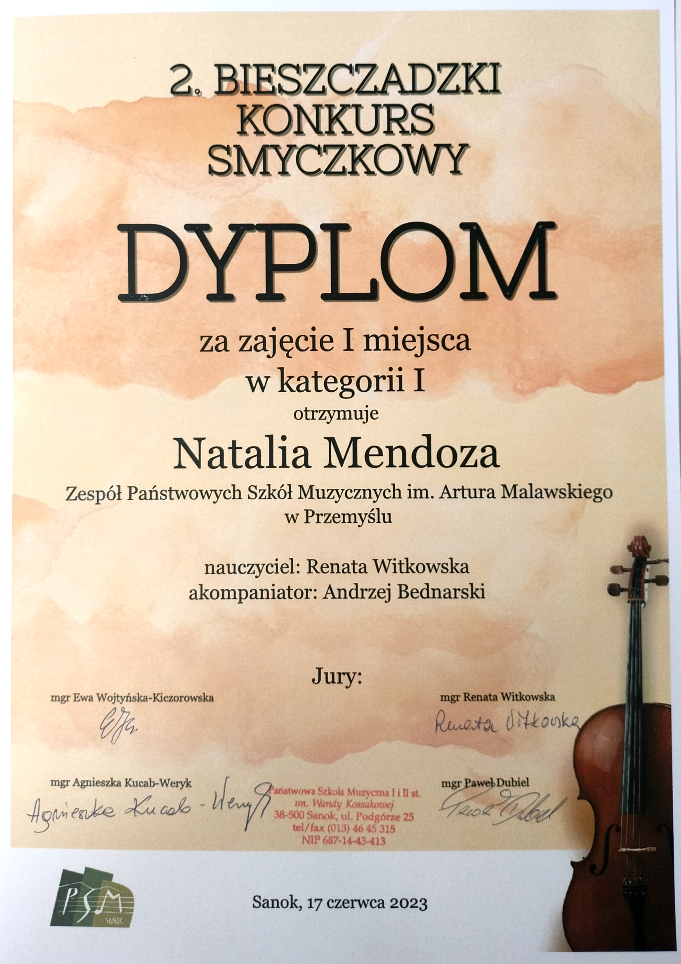 W konkursie tym bardzo dobrze zaprezentowała się pierwszoklasistka Natalia Mendoza, uczennica klasy altówki pani Renaty Witkowskiej, zajmując I miejsce w kategorii I.