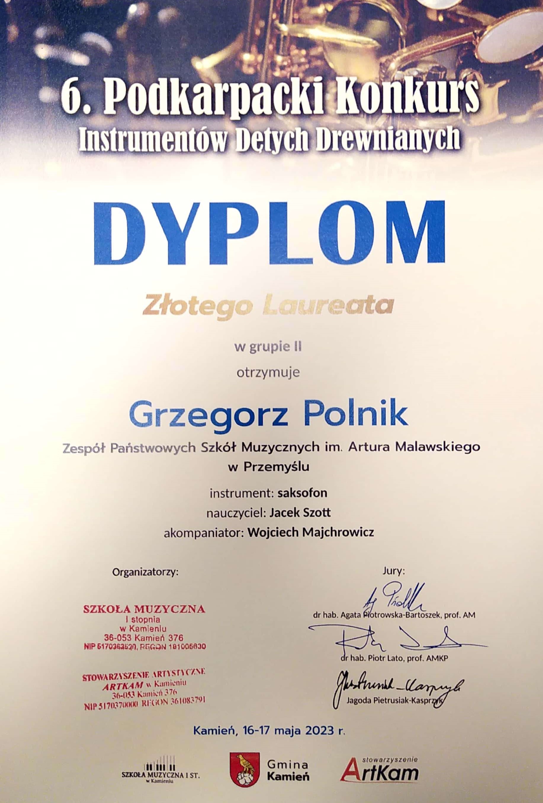 Grzegorz Polnik - Dyplom Złotego Laureata w kategorii II saksofon