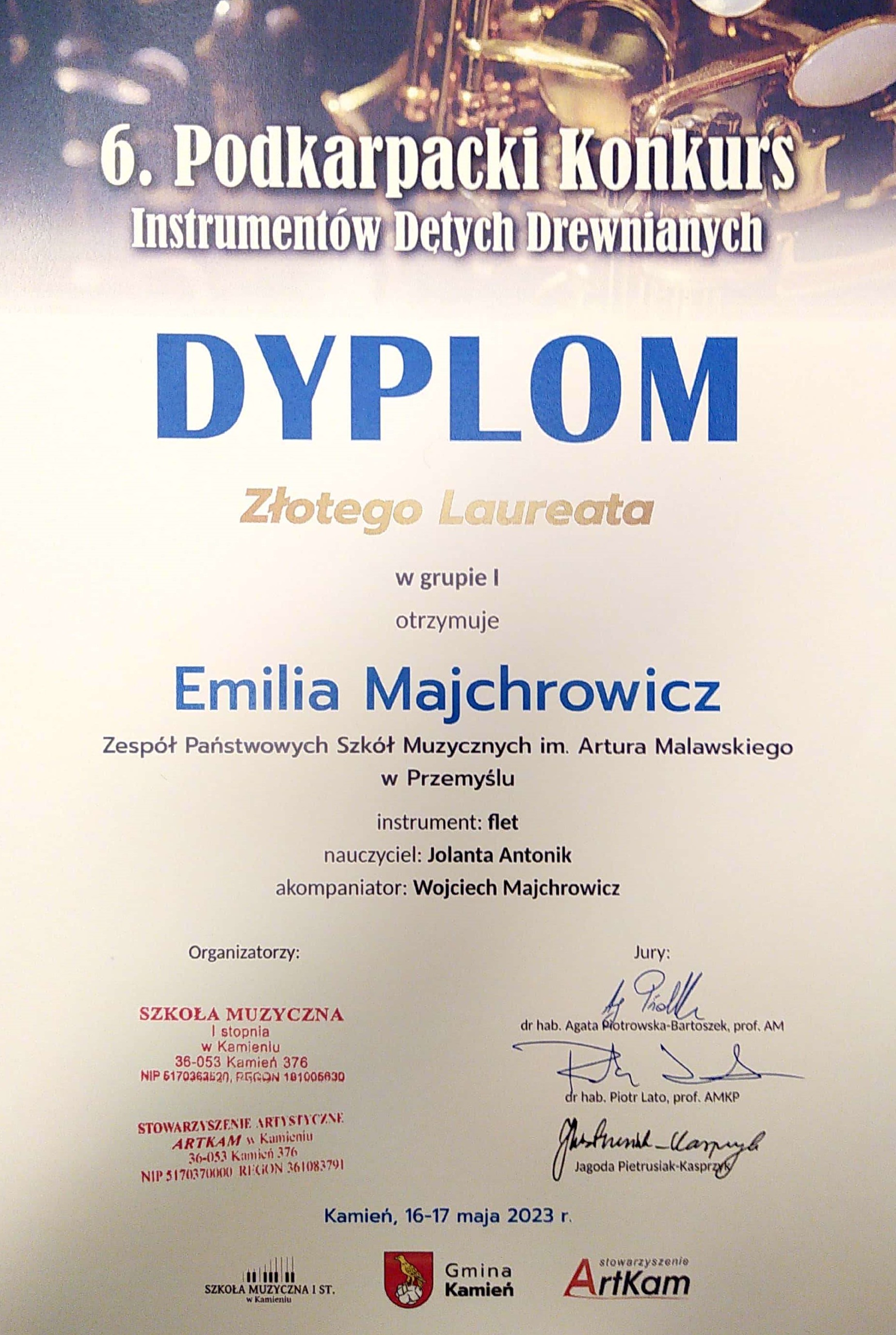 Emilia Majchrowicz - Dyplom Złotego Laureata w kategorii I flet