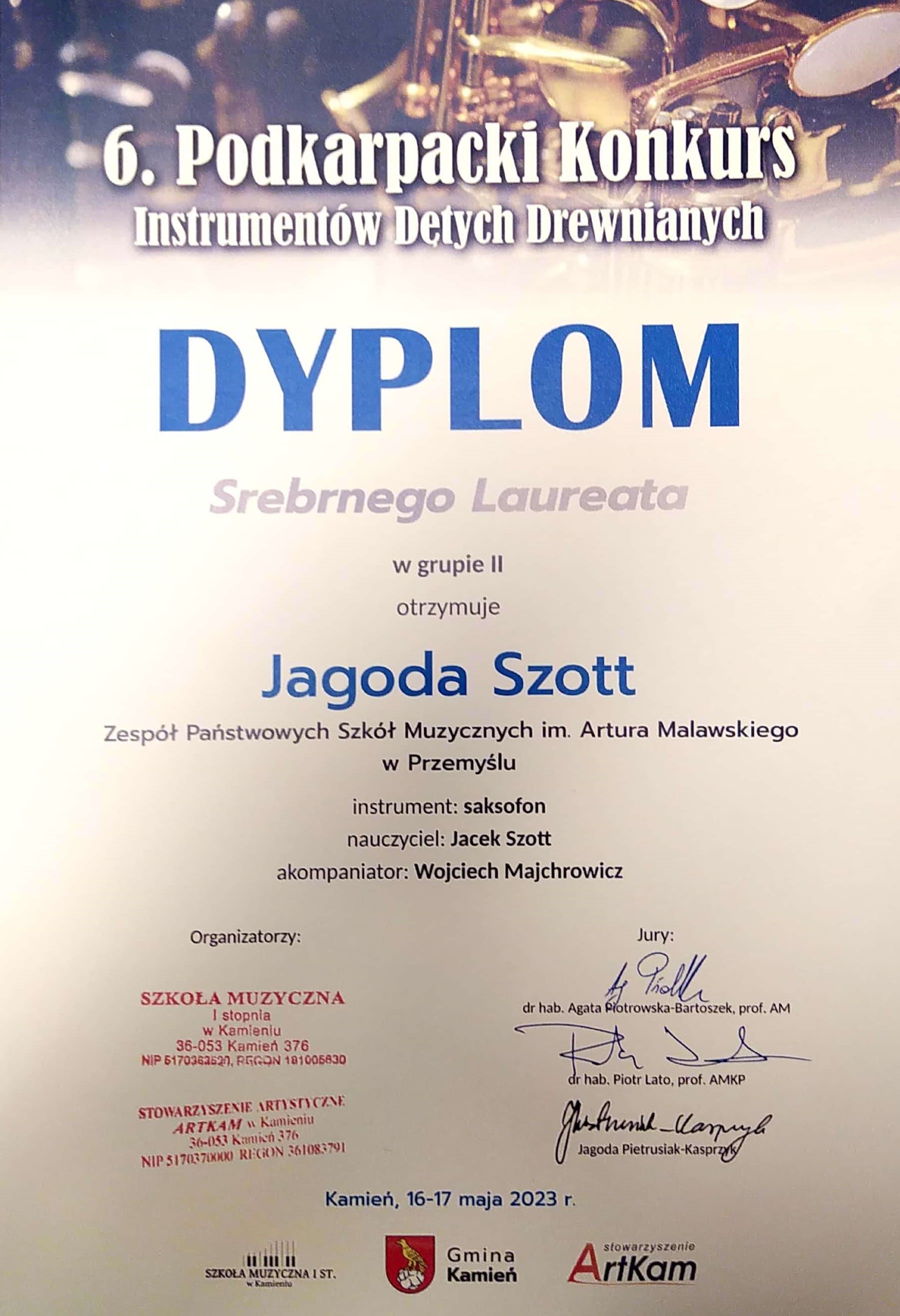 Jagoda Szott - Dyplom Srebrnego Laureata w kategorii II saksofon