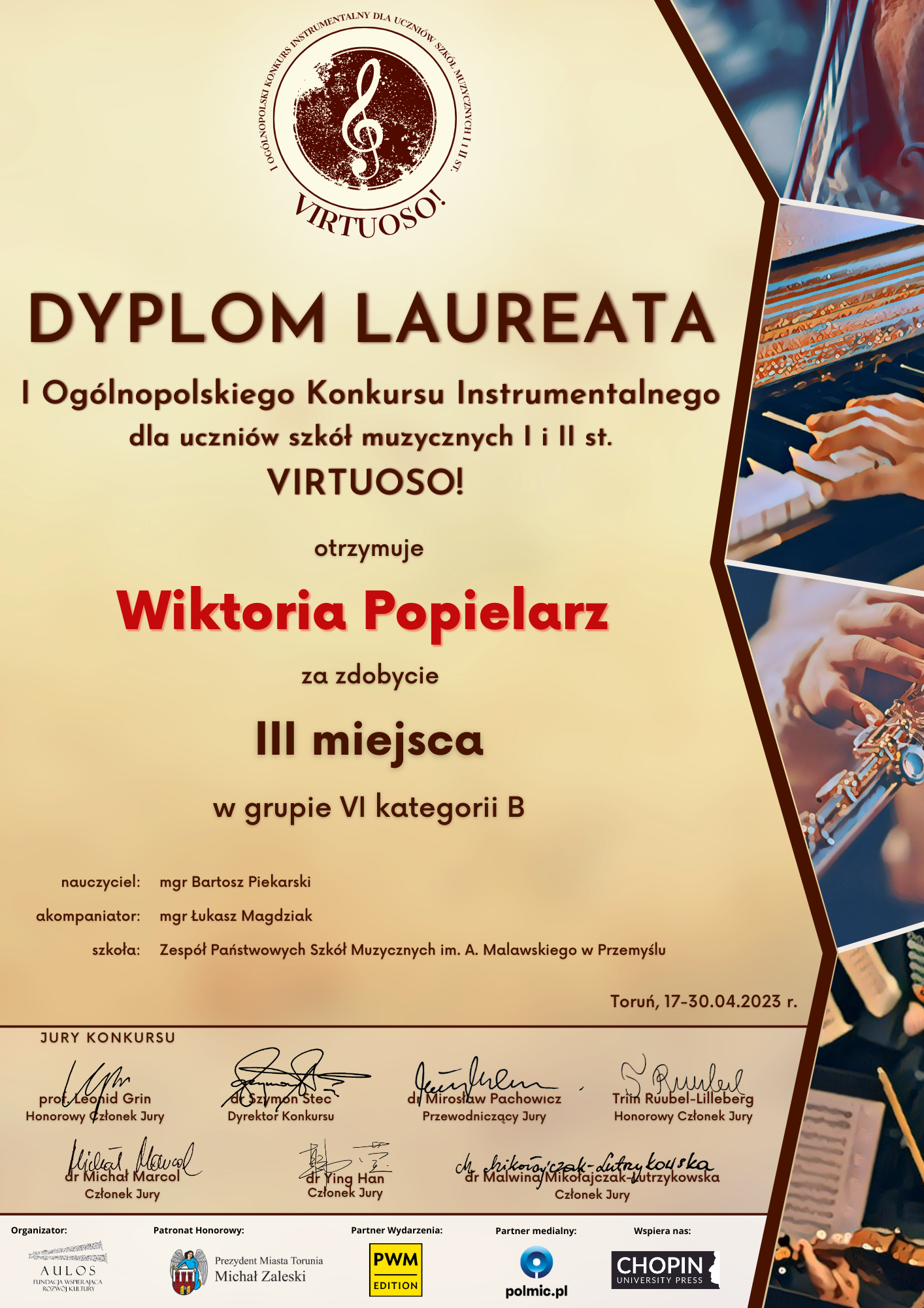 Jury w składzie dr Mirosław Pachowicz – przewodniczący, dr Malwina Mikołajczak-Lutrzykowska, dr Michał Marcol, dr Ying Han, Triin Ruubel-Lilleberg oraz prof. Leonid Grin po przesłuchaniu ponad 500 uczestników doceniło bardzo wysoki poziom prezentowany przez młodych artystów. Uczennica klasy klarnetu Wiktoria Popielarz ( V OSM II st.) znalazła się w nielicznym gronie laureatów zajmując 3 miejsce w kategorii instrumentów dętych drewnianych. Jury przyznało również dyplom uznania dla p. Łukasza Magdziaka za wyróżniający akompaniament oraz dyplom uznania dla p. Bartosza Piekarskiego za wyróżniające przygotowanie Laureatki.
