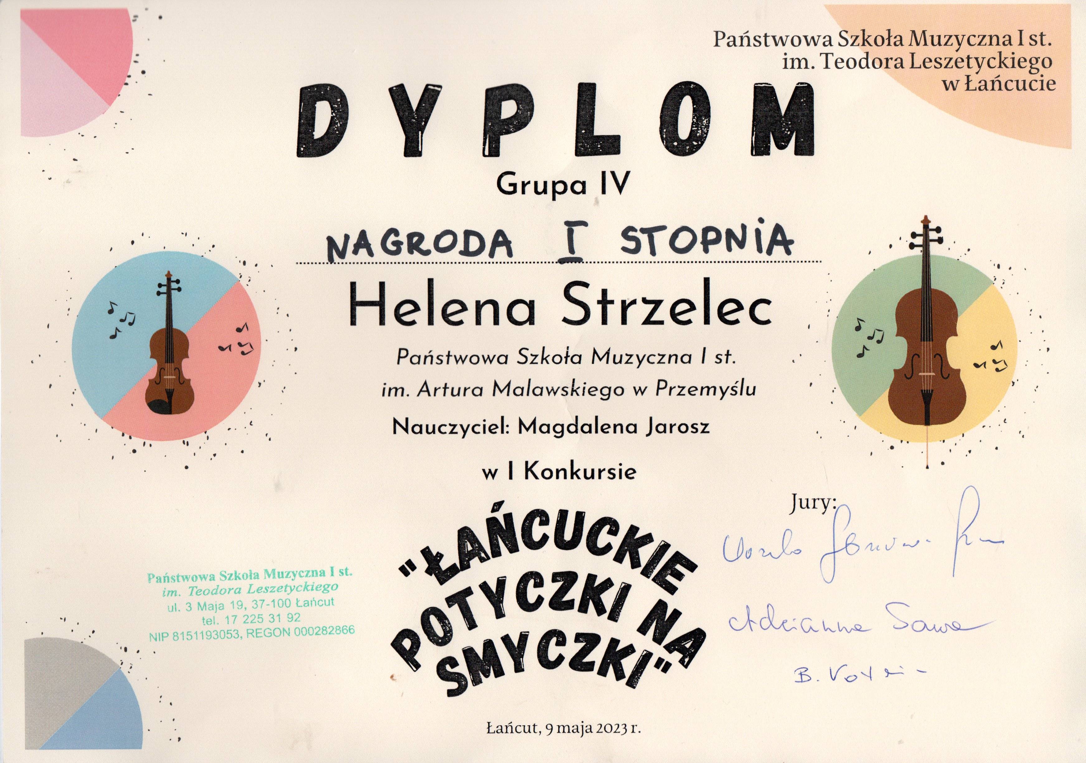 Helena Strzelec z klasy wiolonczeli pani Magdaleny Jarosz zajęła I miejsce w swojej kategorii i uzyskała dyplom I stopnia.