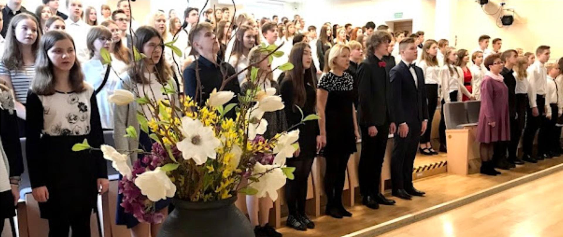 Grafika przedstawia uczniów ZPSM w Szczecienie, śpiewających Hymn Narodowy