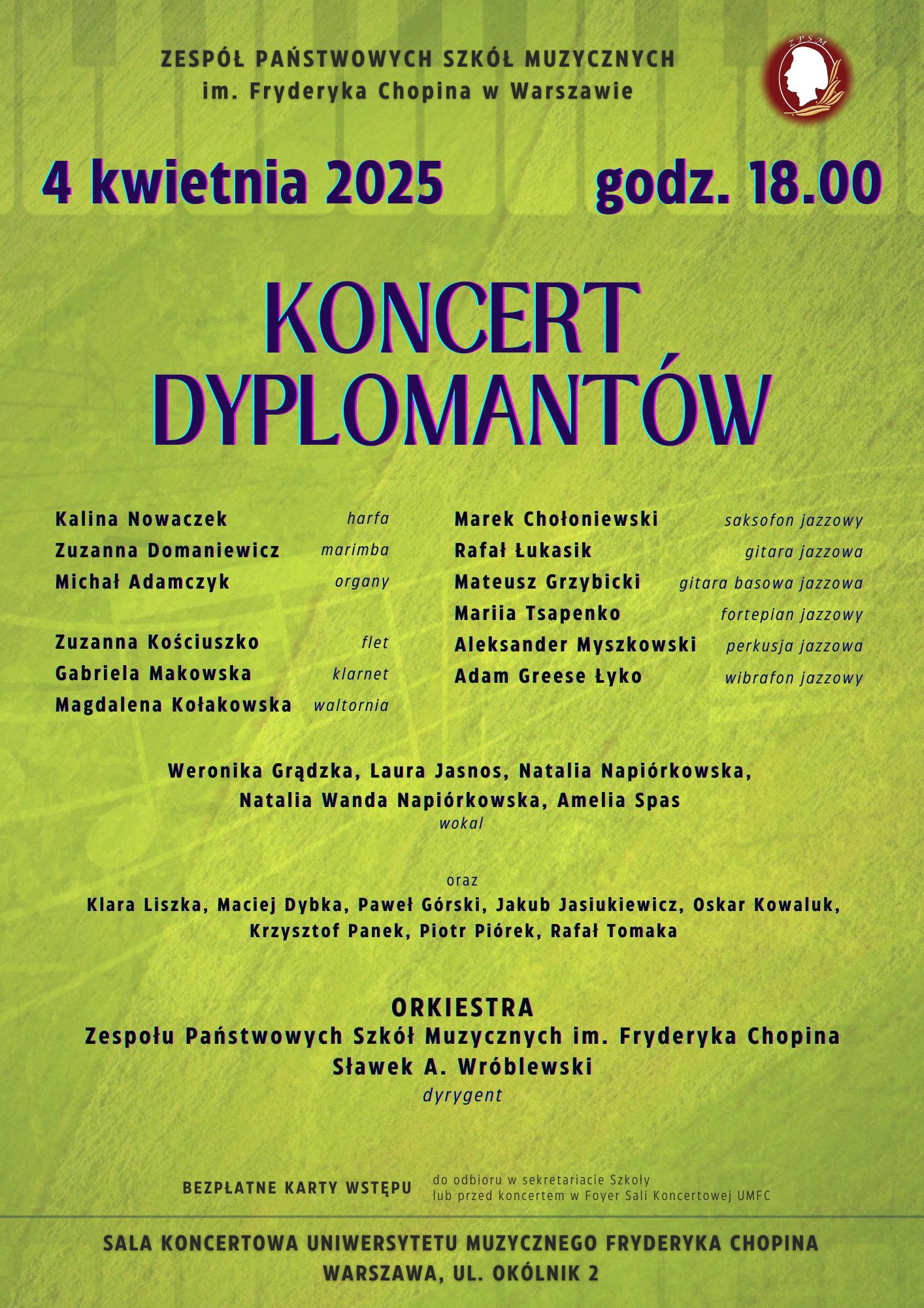 W piątek, 4 kwietnia 2025 r. o godz. 18.00 zapraszamy do Sali Koncertowej Uniwersytetu Muzycznego Fryderyka Chopina w Warszawie przy ul. Okólnik 2 na koncert tegorocznych dyplomantów naszej Szkoły.