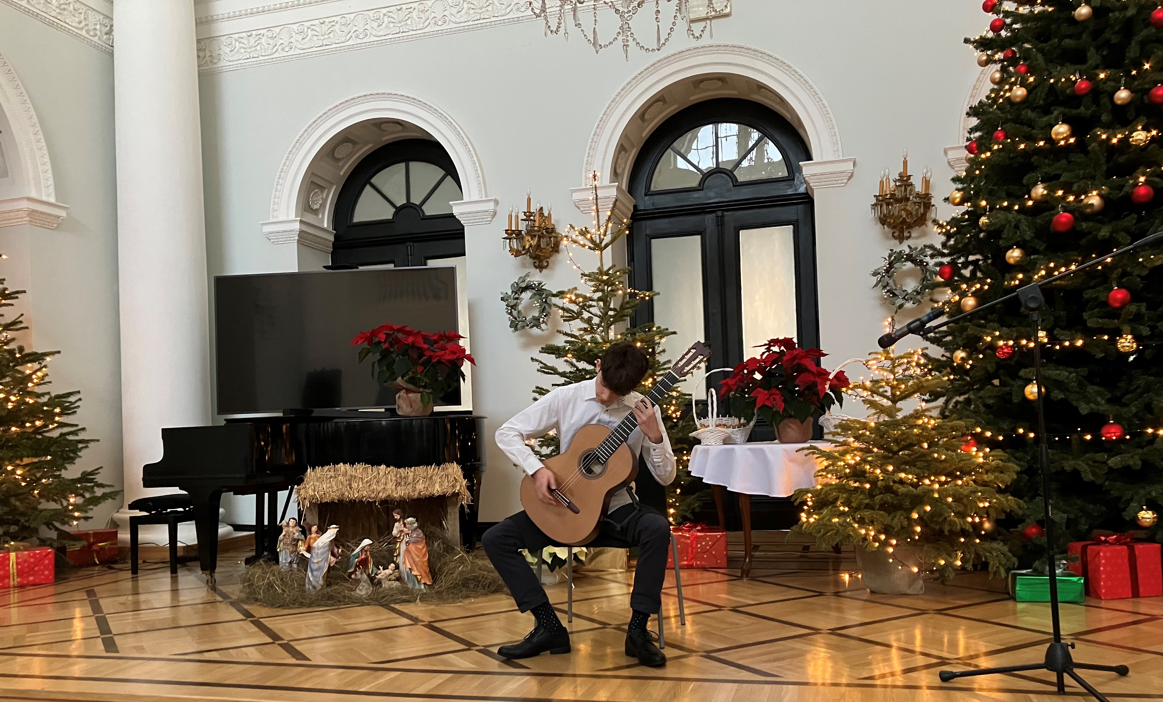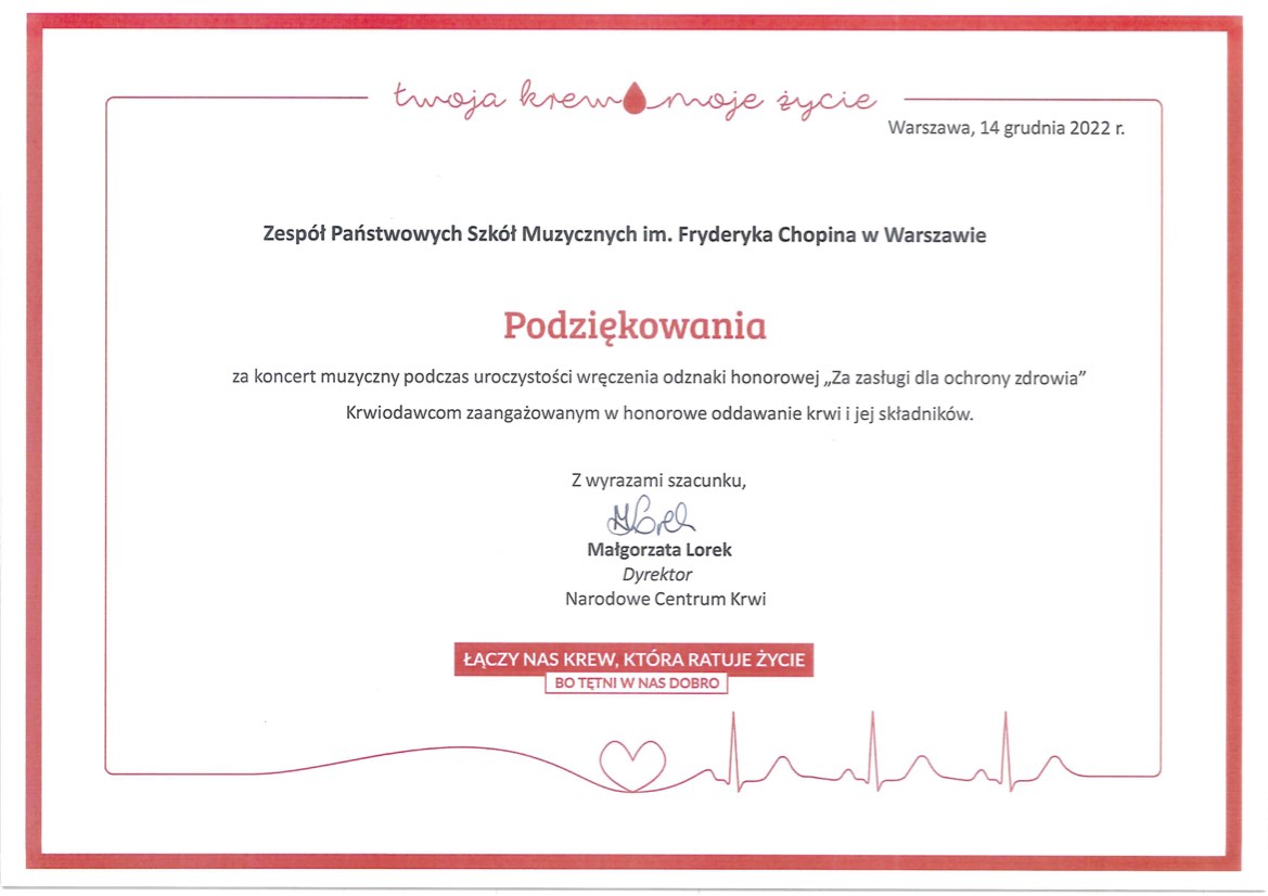 W środę 14 grudnia 2022 uczeń naszej szkoły - Piotr Krawczykiewicz z klasy gitary Andrzeja Olewińskiego - wystąpił w gmachu Ministerstwa Zdrowia przy ul. Miodowej 15 podczas uroczystości wręczenia odznaczeń zasłużonym honorowym dawcom krwi z całej Polski.