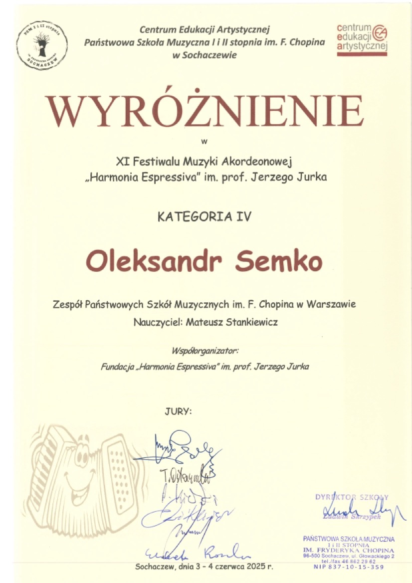 Wyróżnienie - XI Festiwal Muzyki Akordeonowej "Harmonia Espressiva" im. prof. Jerzego Jurka