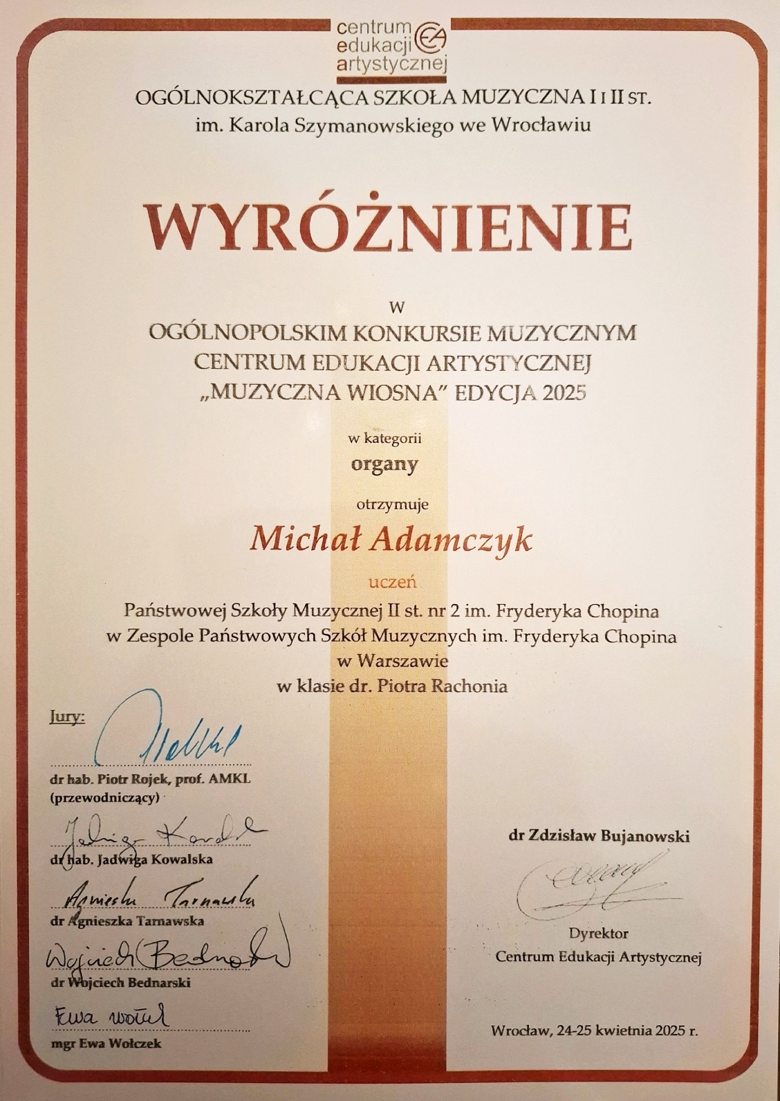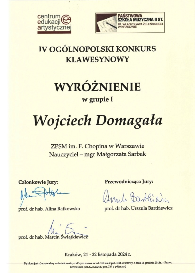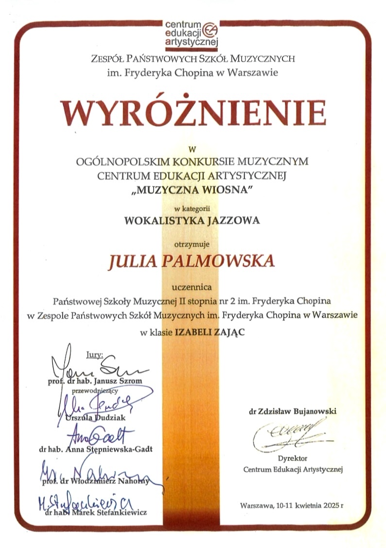 Wyróżnienie - Ogólnopolski Konkurs Muzyczny Centrum Edukacji Artystycznej "Muzyczna Wiosna"