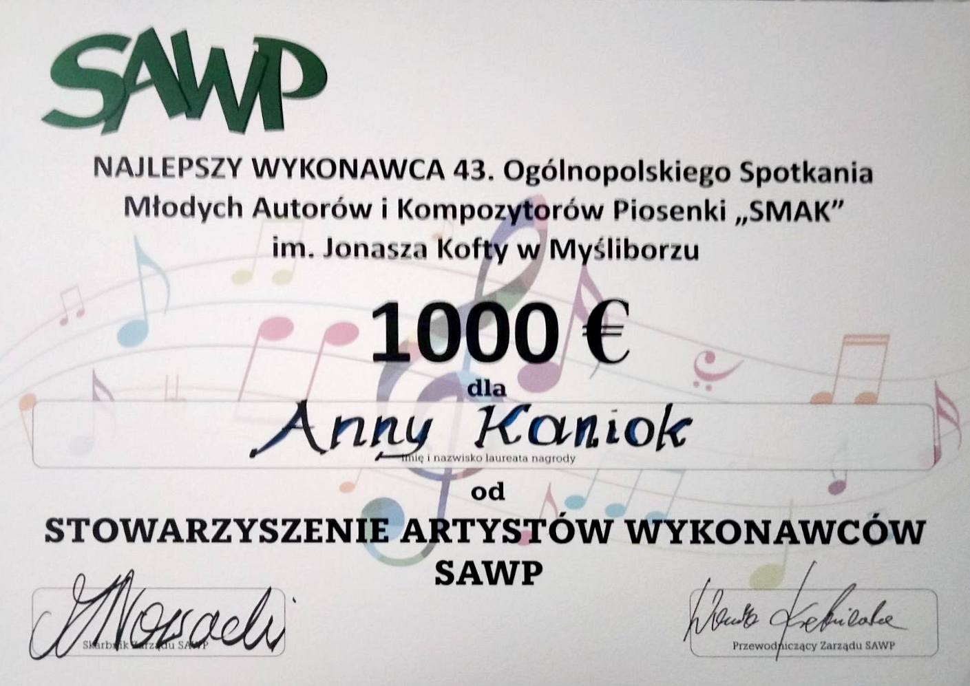 Nagroda indywidualna SAWP dla najlepszego wykonawcy - 43. Ogólnopolskie Spotkania Młodych Autorów i Kompozytorów Piosenki "Smak" im. Jonasza Kofty w Myśliborzu