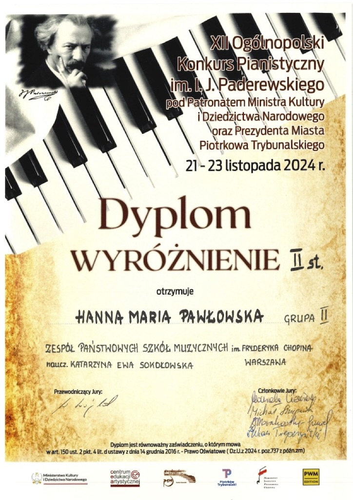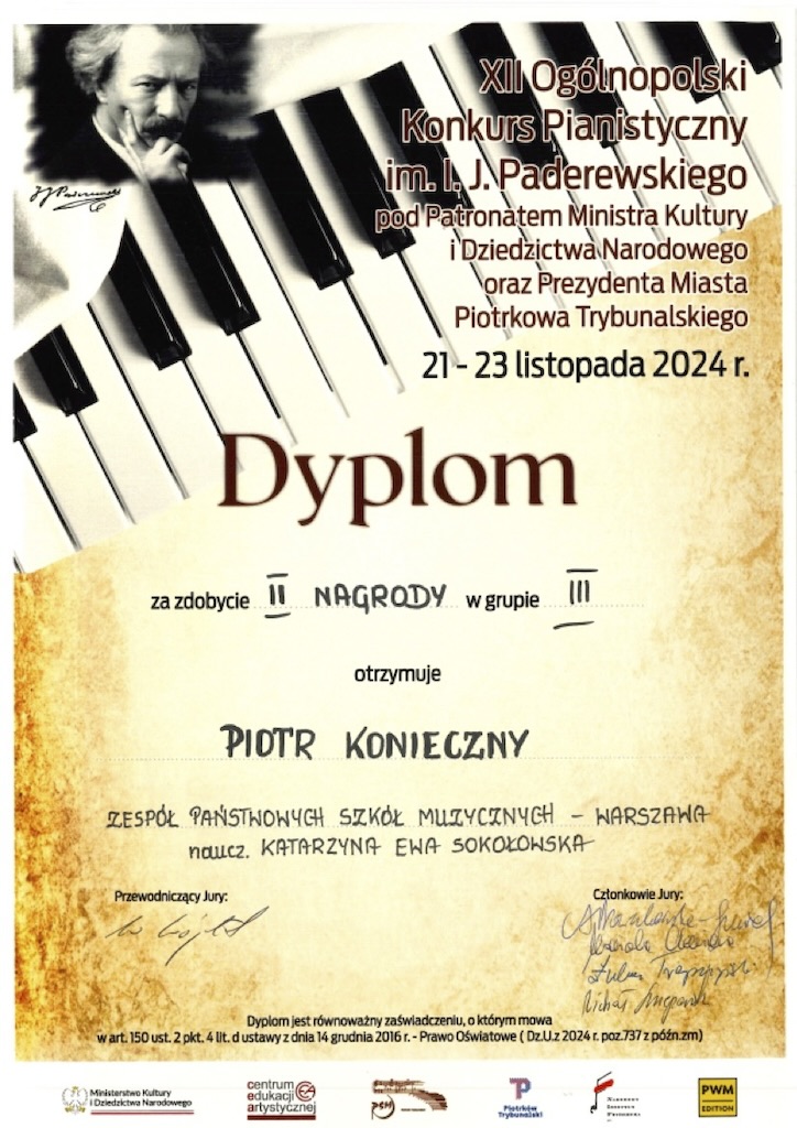 II Nagroda - XII Ogólnopolski Konkurs Pianistyczny im. I. J. Paderewskiego