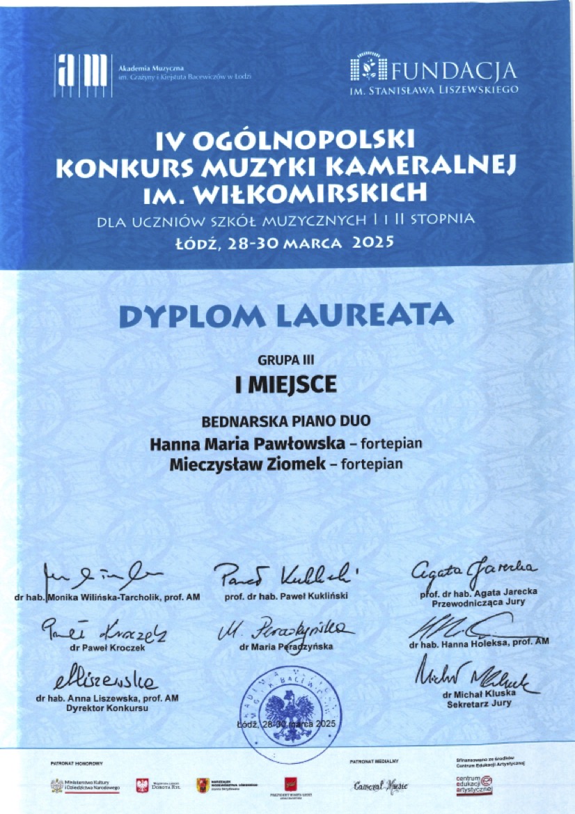 I miejsce - IV Ogólnopolski Konkurs Muzyki Kameralnej im. Wiłkomirskich