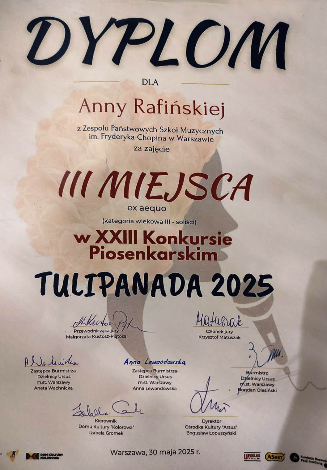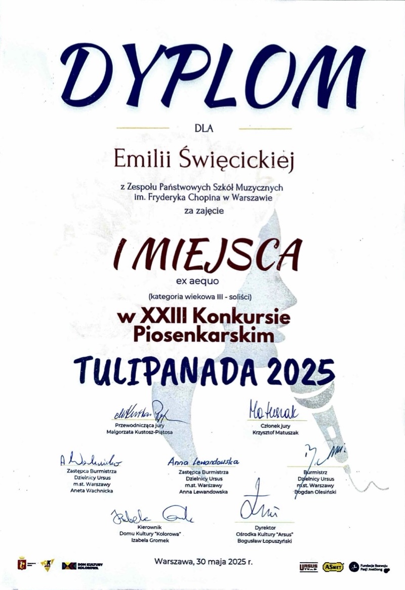 III miejsce w III kategorii wiekowej - XXIII Konkurs Piosenkarski Tulipanada