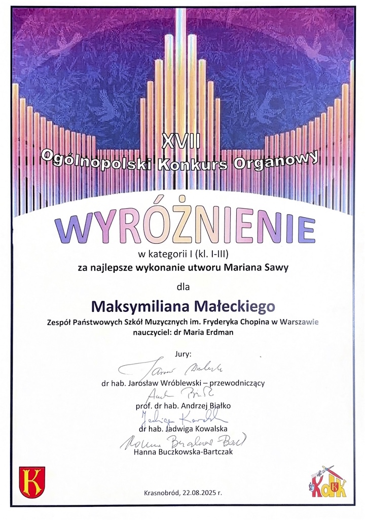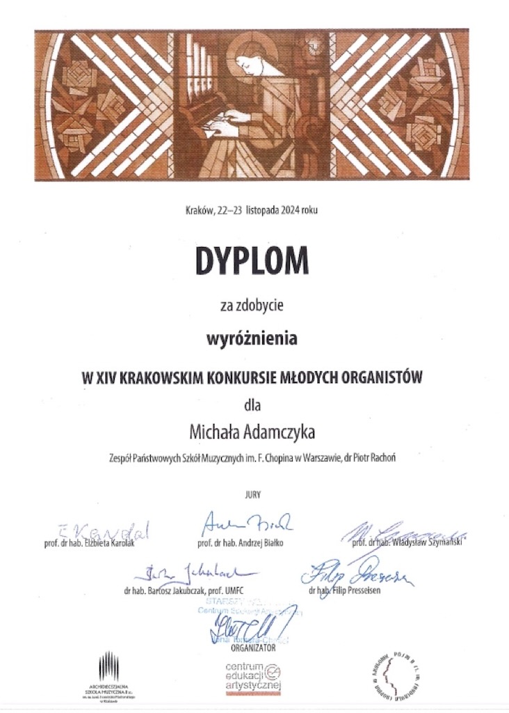 Wyróżnienie - XIV Krakowski Konkurs Młodych Organistów