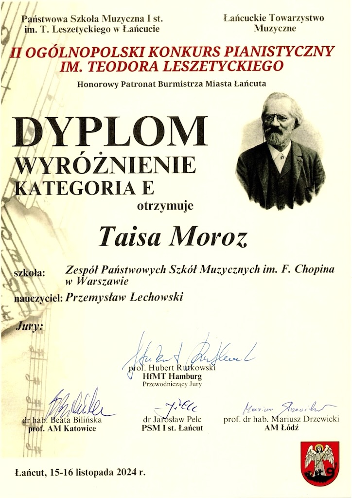 Wyróżnienie - II Ogólnopolski Konkurs Pianistyczny im. Teodora Leszetyckiego