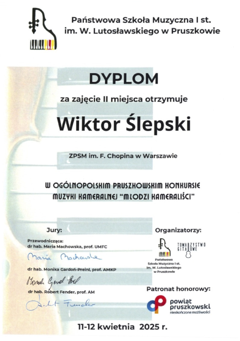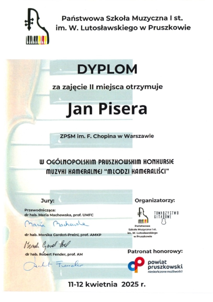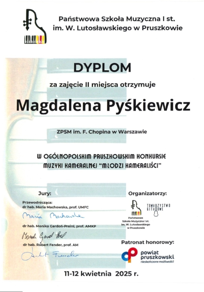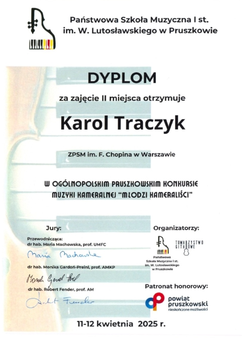 II miejsce - Ogólnopolski Pruszkowski Konkurs Muzyki Kameralnej "Młodzi Kameraliści'',