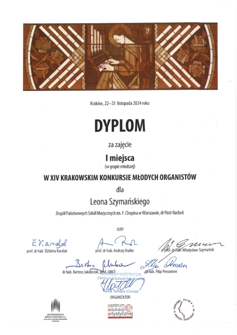 I miejsce - XIV Krakowski Konkurs Młodych Organistów