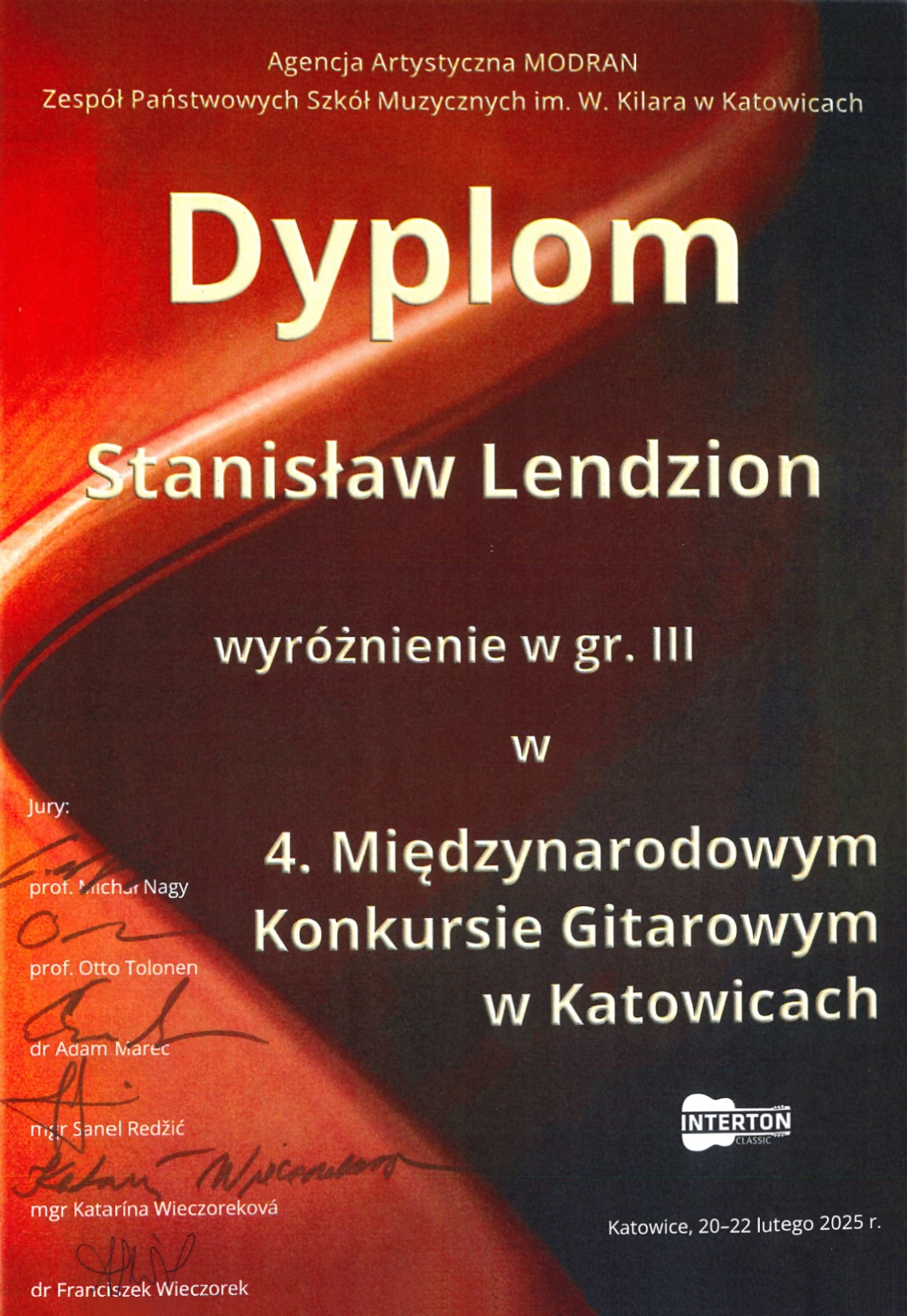 Wyróżnienie - Międzynarodowy Konkurs Gitarowy w Katowicach