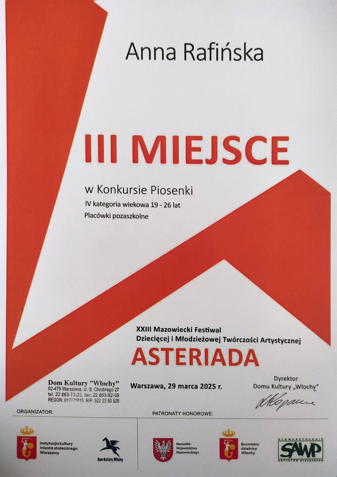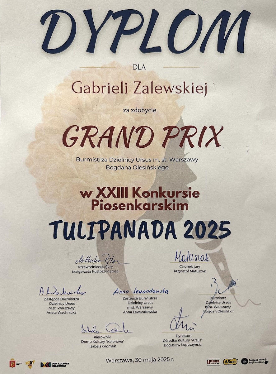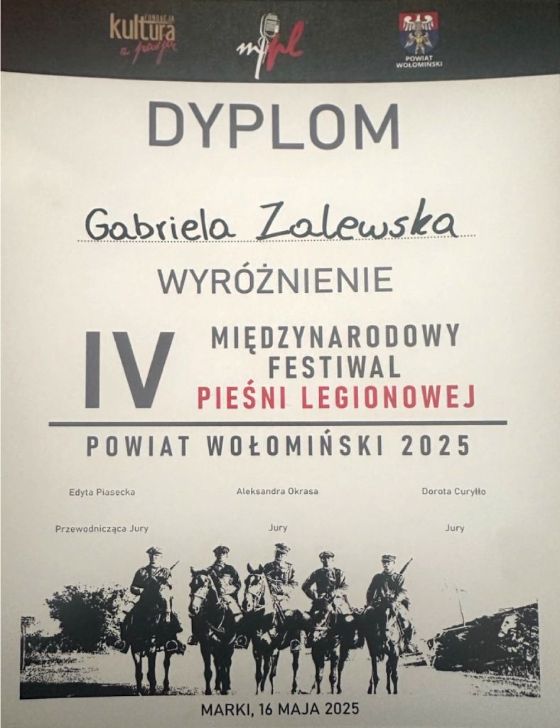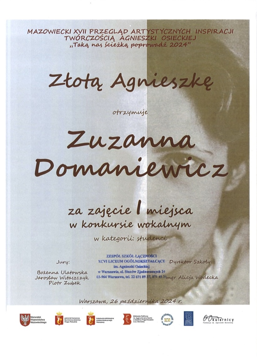 "Złota Agnieszka" za zajęcie I miejsca - konkurs wokalny MAZOWIECKIEGO XVII PRZEGLĄDU ARTYSTYCZNYCH INSPIRACJI TWÓRCZOŚCIĄ AGNIESZKI OSIECKIEJ „Taką nas ścieżką poprowadź 2024”