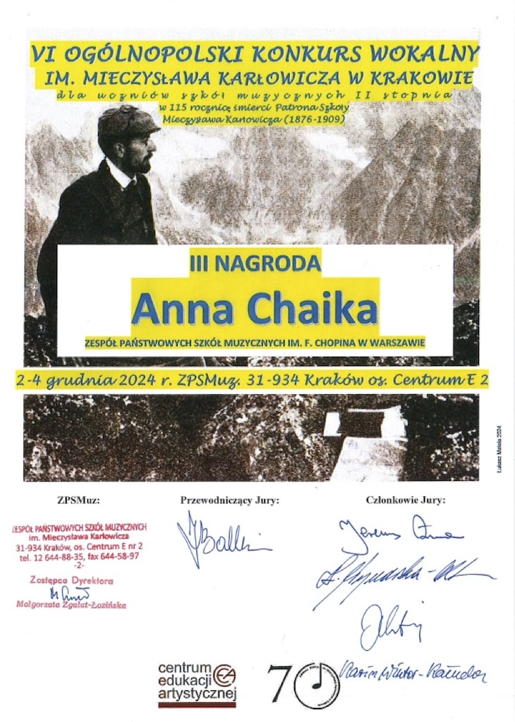 III miejsce - VI Ogólnopolski Konkurs Wokalny im. Mieczysława Karłowicza w Krakowie