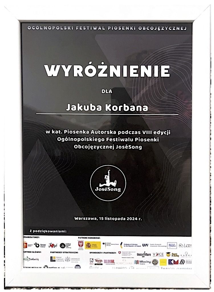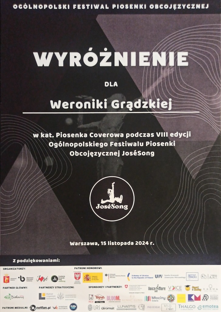 Wyróżnienie w kat. Piosenka Coverowa - Ogólnopolski Festiwal Piosenki Obcojęzycznej JoséSong