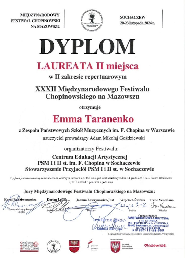 II miejsce - XXXII Międzynarodowy Festiwal Chopinowski na Mazowszu