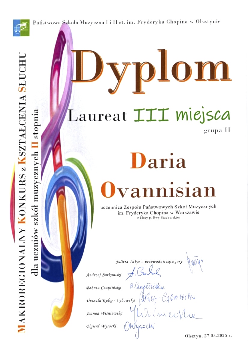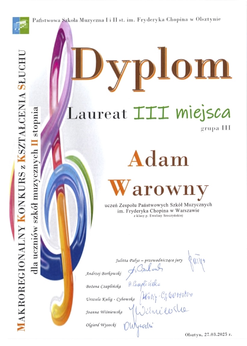 III miejsce - Makroregionalny Konkurs z Kształcenia Słuchu dla Szkół Muzycznych II stopnia