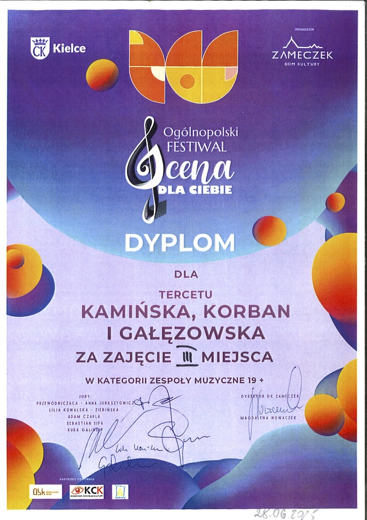 III miejsce z zespołem "Kamińska, Korban i Gałązkowska" w kategorii zespoły muzyczne 19+