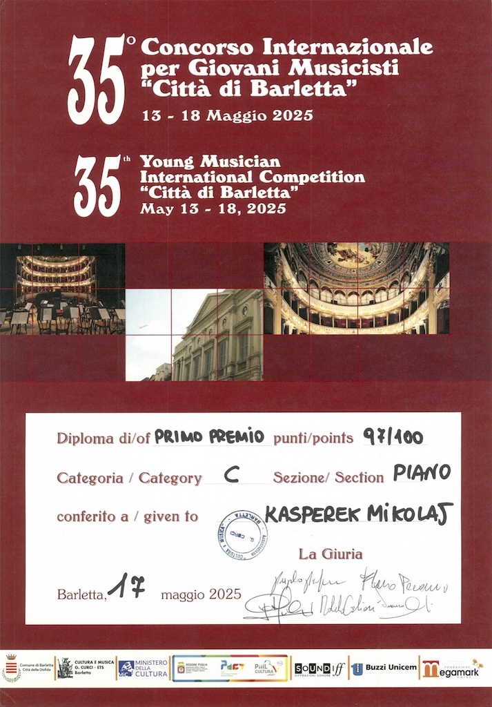 I miejsce - Międzynarodowy Konkurs Młodych Muzyków „Citta di Barletta"