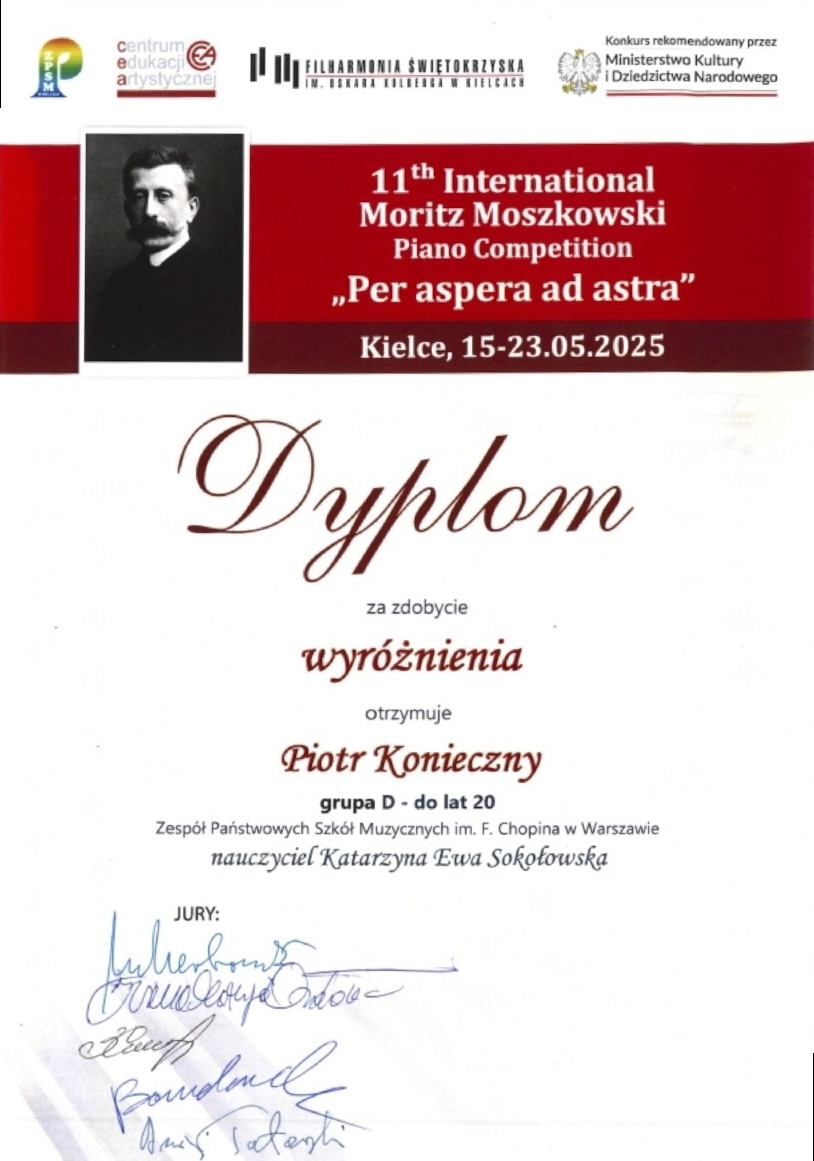 Wyróżnienie - XI Międzynarodowy Konkurs Pianistyczny im. Maurycego Moszkowskiego „PER ASPERA AD ASTRA''