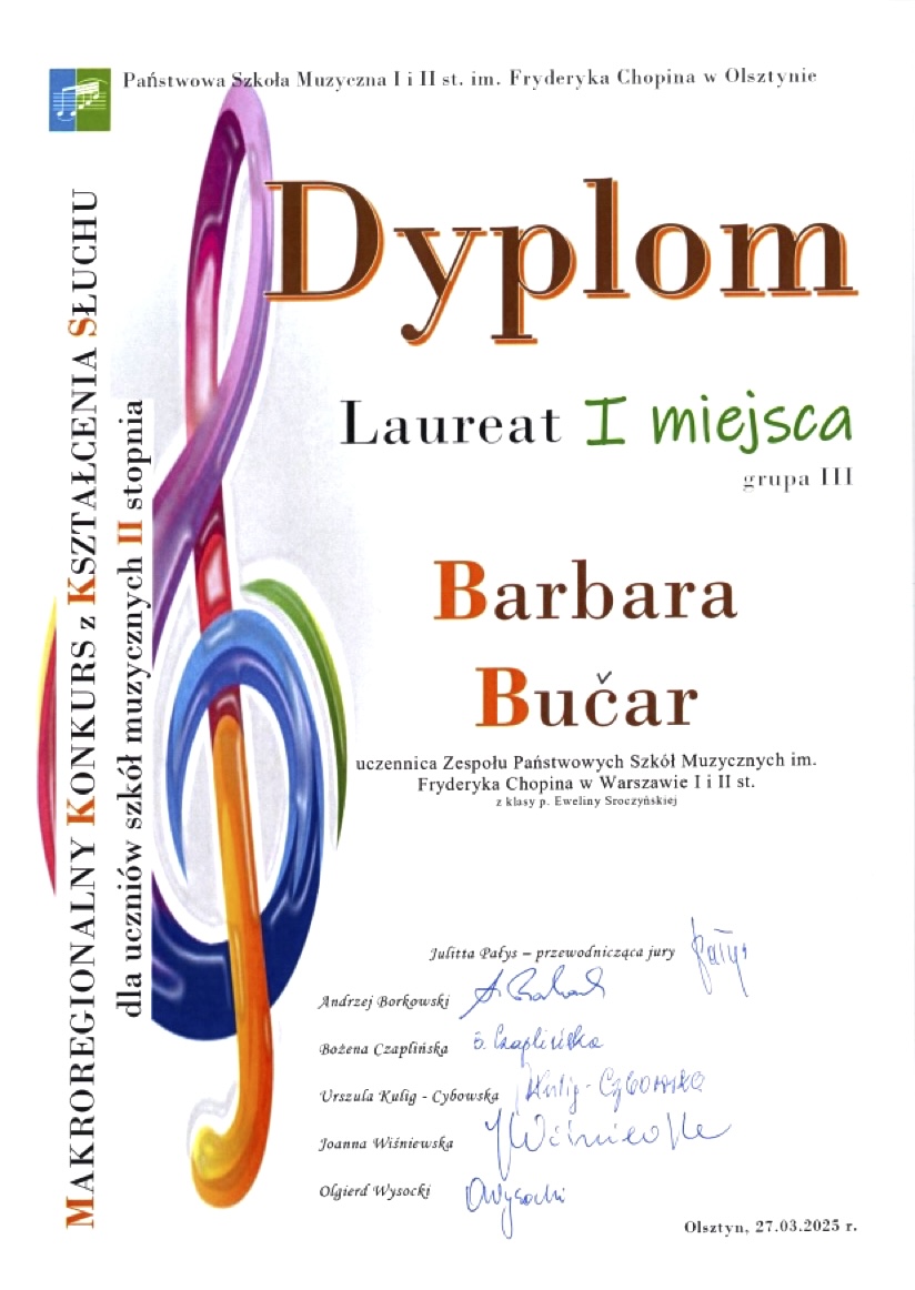 I miejsce - Makroregionalny Konkurs z Kształcenia Słuchu dla Szkół Muzycznych II stopnia