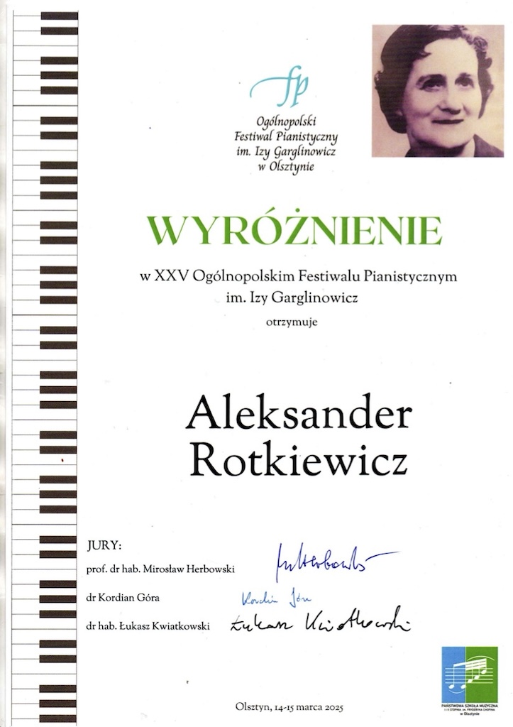 Wyróżnienie - XXV Ogólnopolski Festiwal Pianistyczny im. Izy Garglinowicz